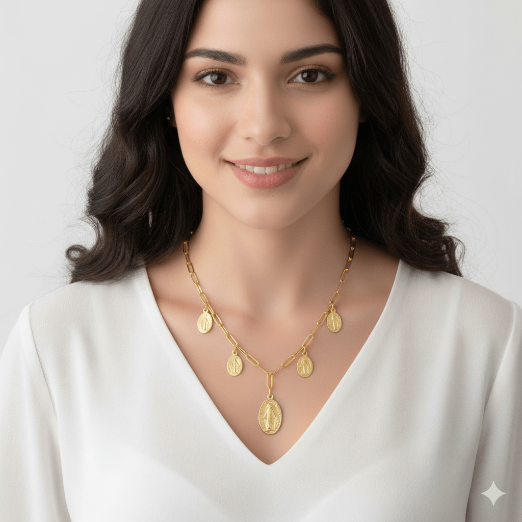 Celebrate faith and style with this unique 18K gold-plated paperclip chain necklace featuring five glossy Miraculous Medals. This trendy and meaningful piece makes a thoughtful gift for birthdays, graduations, or any special occasion. The adjustable chain ensures a perfect fit, while the multiple medals add a touch of divine protection and elegance to any outfit.