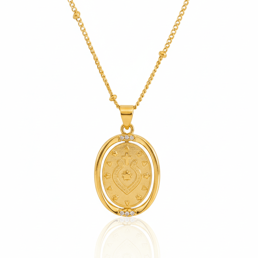 Suspended from an 18-inch gold-plated chain, the necklace sits comfortably at the collarbone, offering a graceful and meaningful presence. Lightweight and well-made, it serves as a constant reminder of Our Lady’s protection, love, and intercession.