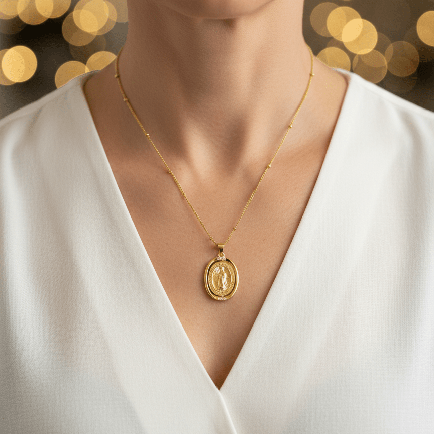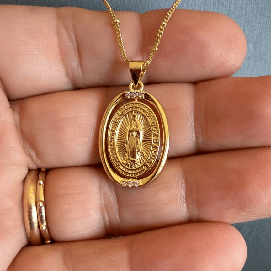 The oval Guadalupe medal features a classic depiction of Our Lady of Guadalupe, framed in a smooth gold-plated setting that highlights the sacred image without distraction. Its balanced proportions make it easy to wear every day, whether alone or layered with other devotional pieces.