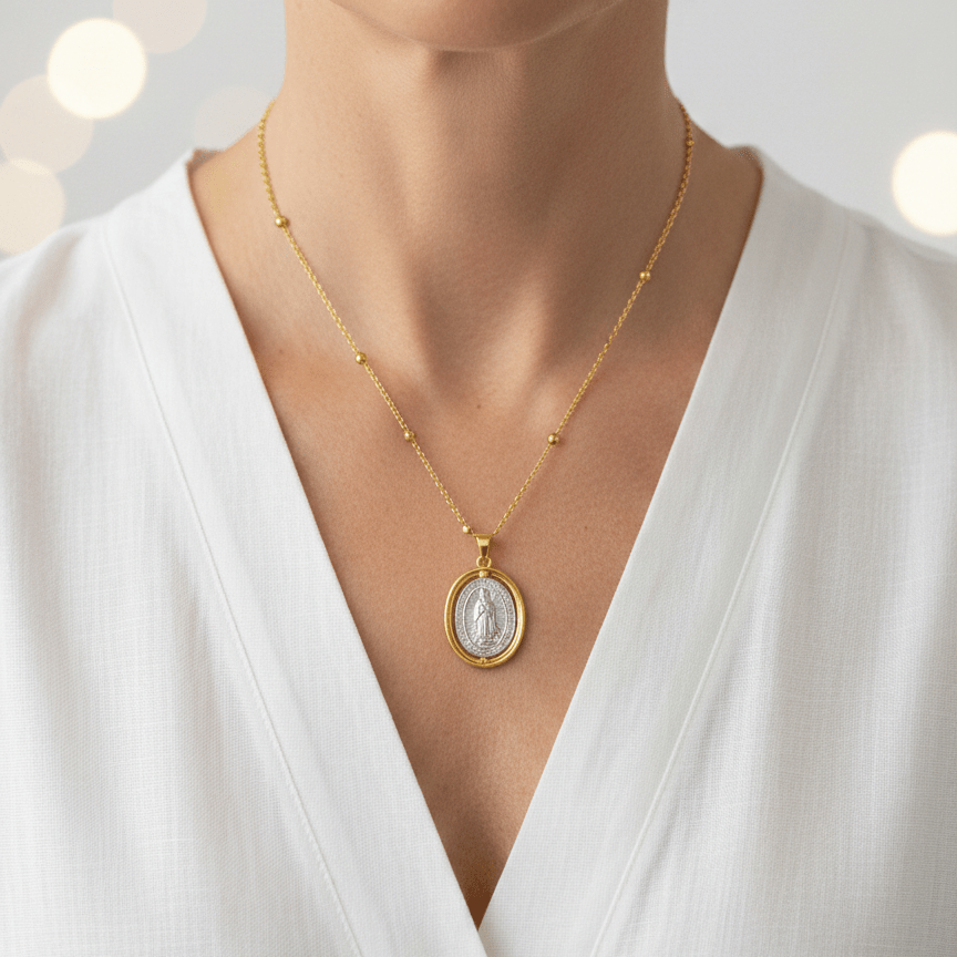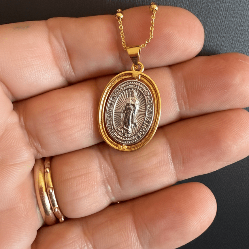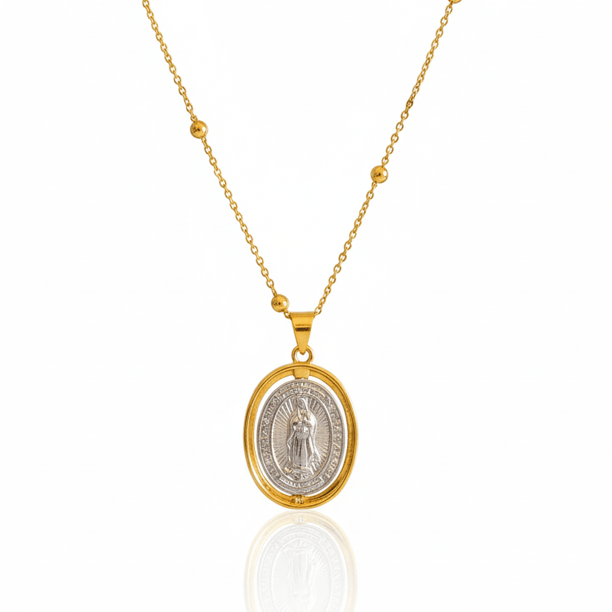 The oval Guadalupe medal features a silver-plated image of Our Lady of Guadalupe, framed by a yellow gold-plated bezel that adds warmth and depth to the sacred image. The two-tone finish highlights the medal’s details while maintaining a balanced, reverent look.