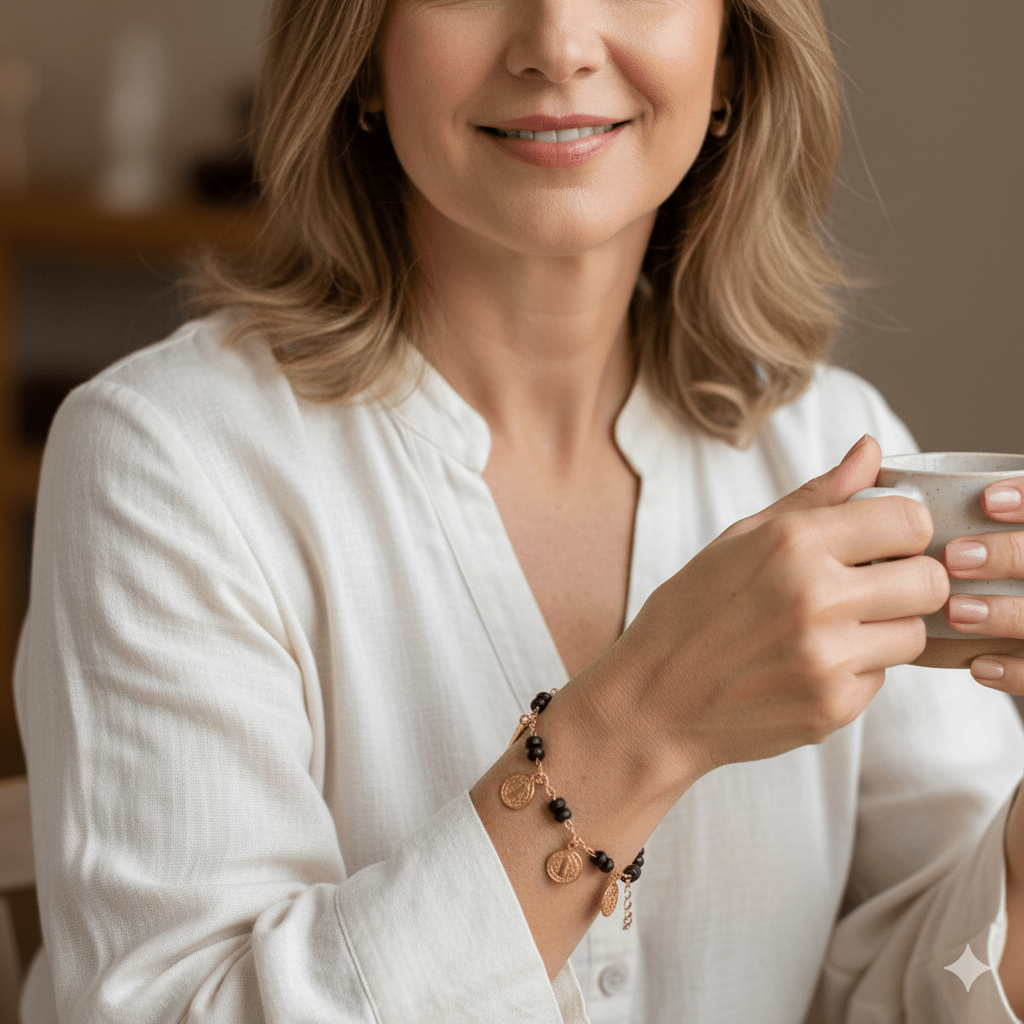 For centuries, the Saint Benedict Medal has been venerated as a powerful symbol of protection against evil and spiritual danger. This bracelet beautifully weaves tradition and style, combining polished gold tones with deep black beads for a striking contrast that complements both casual and formal wear.