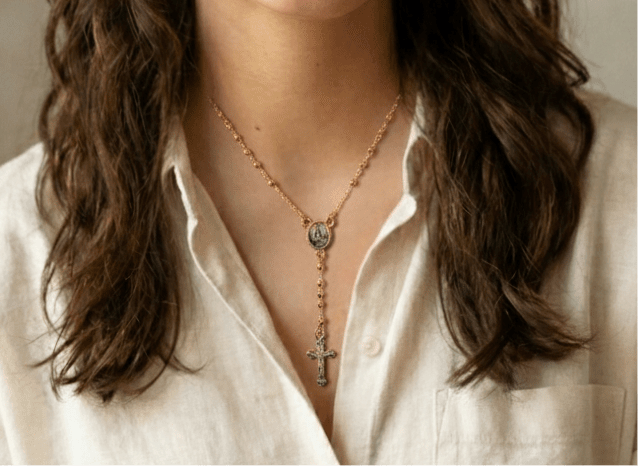 This three-toned rosary necklace features a stunning Our Lady of Charity and a dangling crucifix. The traditional rosary design adds meaning to this delicate piece of jewelry, while the three different colors give it a modern edge. The necklace reminds us to include prayer in everyday life and adds a colorful sparkle to any outfit.