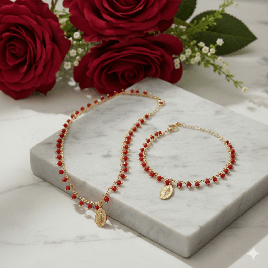 The Miraculous Medal Red Bead Bracelet - the ultimate faith-infused accessory. This exquisite bracelet boasts a gold-plated finish and red beads that frame the beloved Miraculous Medal, a symbol of devotion and grace. It comes in a stylish white box, perfect for gifting. Order now and exude confidence and grace wherever you go!