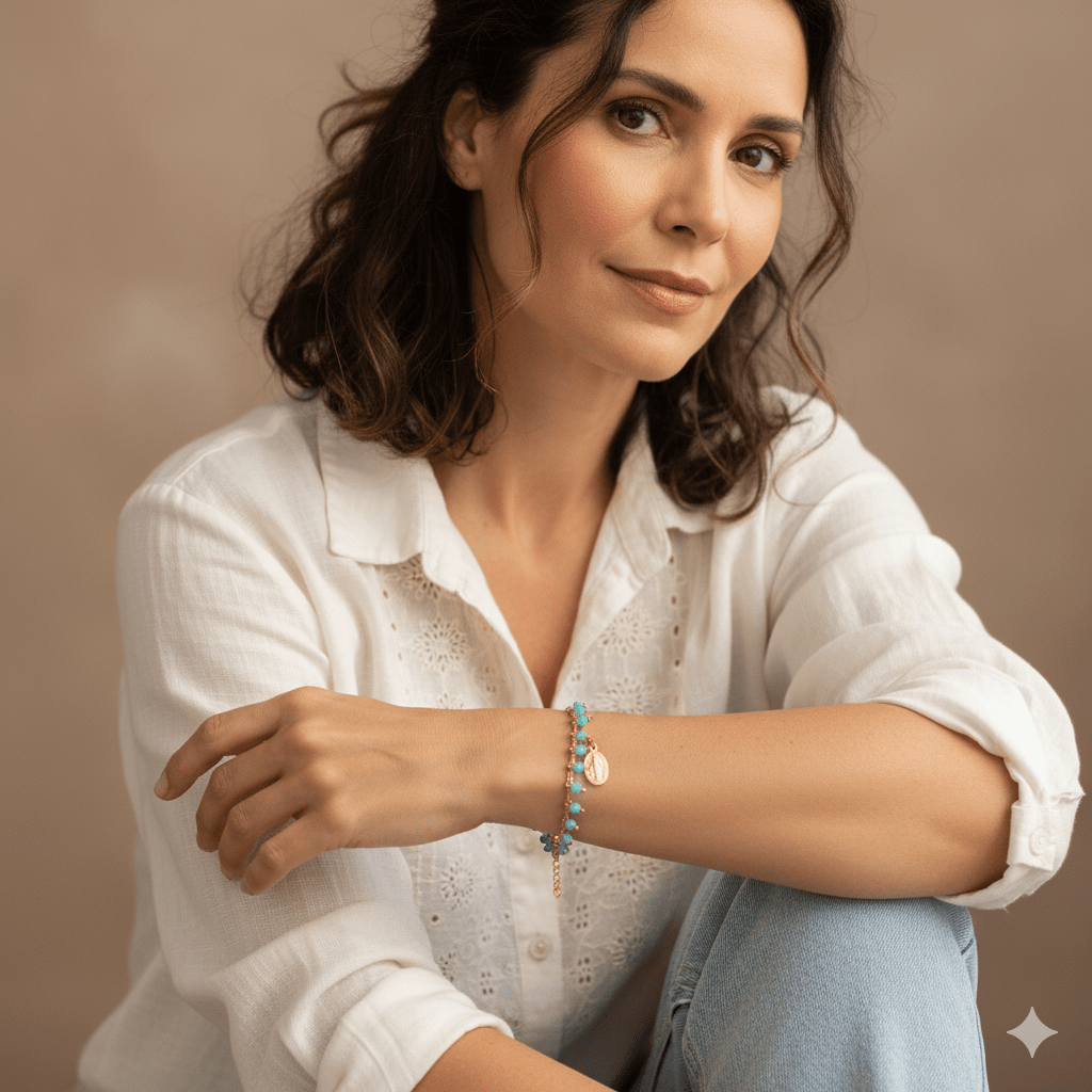 This beautiful Miraculous Pearl Blessing Bracelet offers a touch of heavenly grace and timeless symbolism. Delicate turquoise beads and a lustrous gold-plated finish create an elegant and spiritually meaningful piece. The centerpiece of this exquisite bracelet is the cherished Miraculous Medal, a beloved reminder of faith and devotion. Presented in a sleek white box, it makes a thoughtful gift for yourself or a loved one.