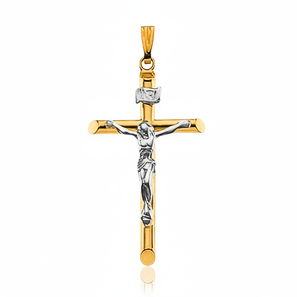 Made entirely of solid 14K gold, this crucifix features a refined two-tone design combining yellow and white gold, creating visual depth while preserving classic Catholic symbolism. Its balanced proportions and elegant finish make it suitable for daily wear or for meaningful sacramental occasions.