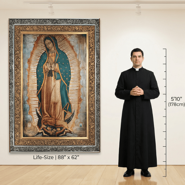 At 88" x 62", this replica matches the exact dimensions of the original Tilma housed in the Basílica de Nuestra Señora de Guadalupe in Mexico City. When your faithful stand before this image, they experience the same scale that pilgrims encounter at the Tepeyac.