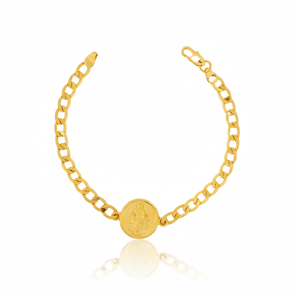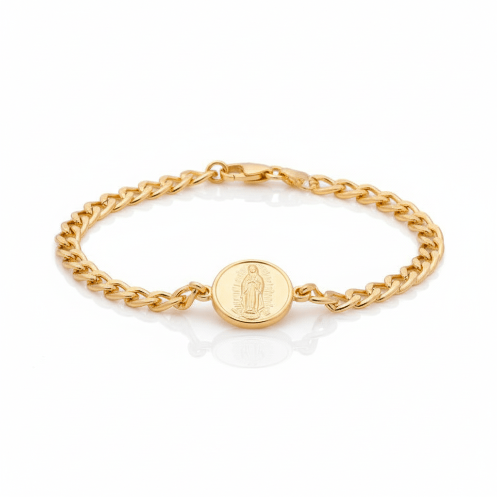 This beautiful Gold Guadalupe Chain Bracelet is a gift of faith and prayer for women devoted to Our Lady of Guadalupe. The meaningful and classic design is made with genuine Mexican gold-filled jewelry and outstanding craftsmanship. Gold-filled jewelry is hypoallergenic, doesn't tarnish quickly, and lasts longer than gold-plated jewelry. This everyday, trendy jewelry piece is an excellent gift for women of all ages. At the center of the pendant is a radiant and beautiful image of the Virgin Mary. This piece adds a golden sparkle to any outfit, making it the perfect gift for anyone who wants to accentuate their business with a delicate touch of elegance.