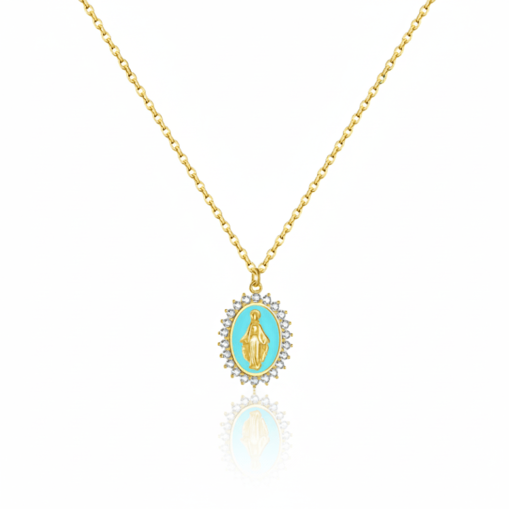 Embrace your faith with our elegant Our Lady of Lourdes necklace, crafted passionately for the modern Catholic woman. This dainty medallion, shimmering in light blue enamel and adorned with delicate white zirconia, is a beautiful reminder of Our Lady's grace. Suspended from an 18k gold-plated sterling silver chain, this necklace is perfect for everyday wear or special occasions. Whether as a gift for yourself or a loved one, this treasured piece will surely become a cherished symbol of your faith journey.