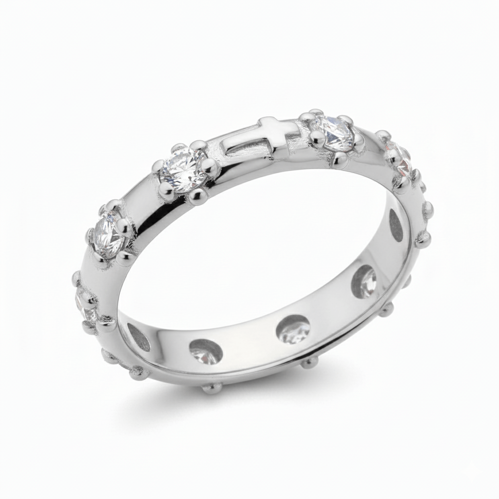 Embrace your faith with grace and style. This genuine sterling silver finger rosary ring, handcrafted in Italy, is more than just jewelry—it's a wearable prayer. Ten sparkling white zirconias guide you through the Hail Marys, while a delicate cross marks the Our Father and Glory Be.