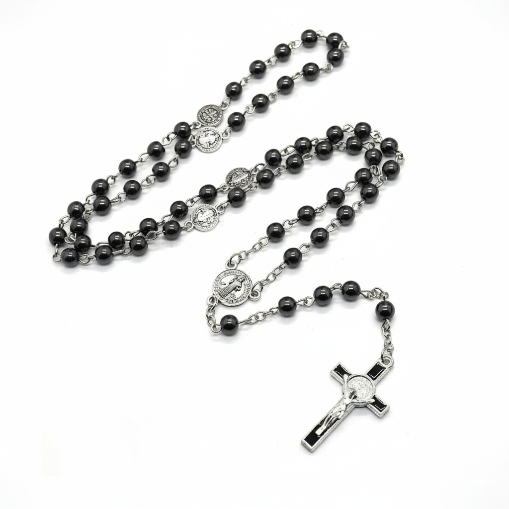 The St Benedict Hematite Rosary is a visual reminder of faith and devotion.