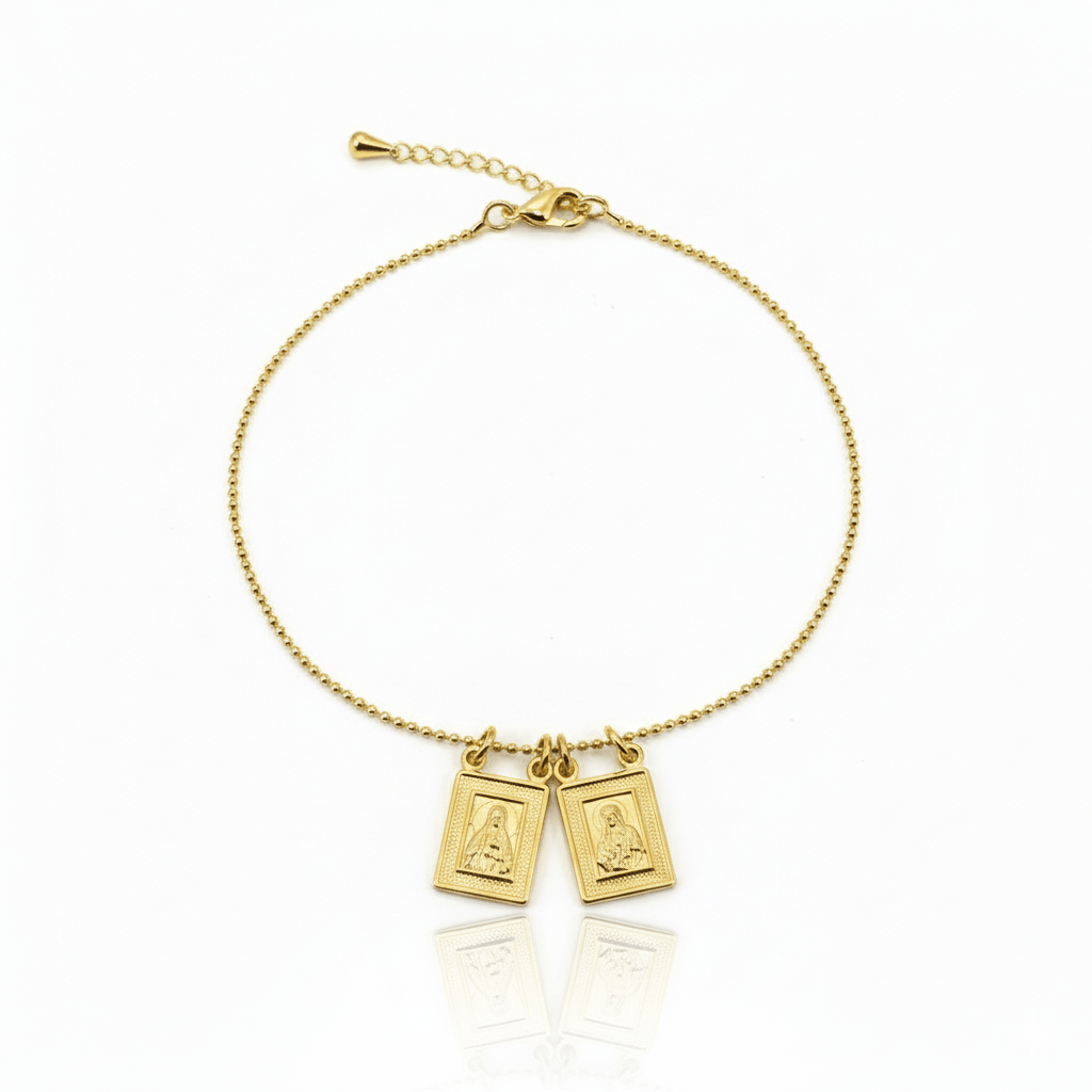 The Gold-Plated Mini Scapular Bracelet is a stunning piece of jewelry that makes a perfect addition to anyone's wardrobe. It features a colorful scapular design with two pendants: one displaying the classic Sacred Heart image on the front, and the other depicting Our Lady of Mount Carmel on the reverse. Crafted from gold-plated brass, this bracelet is perfect for any discerning Catholic who wants to express their devotion in style.