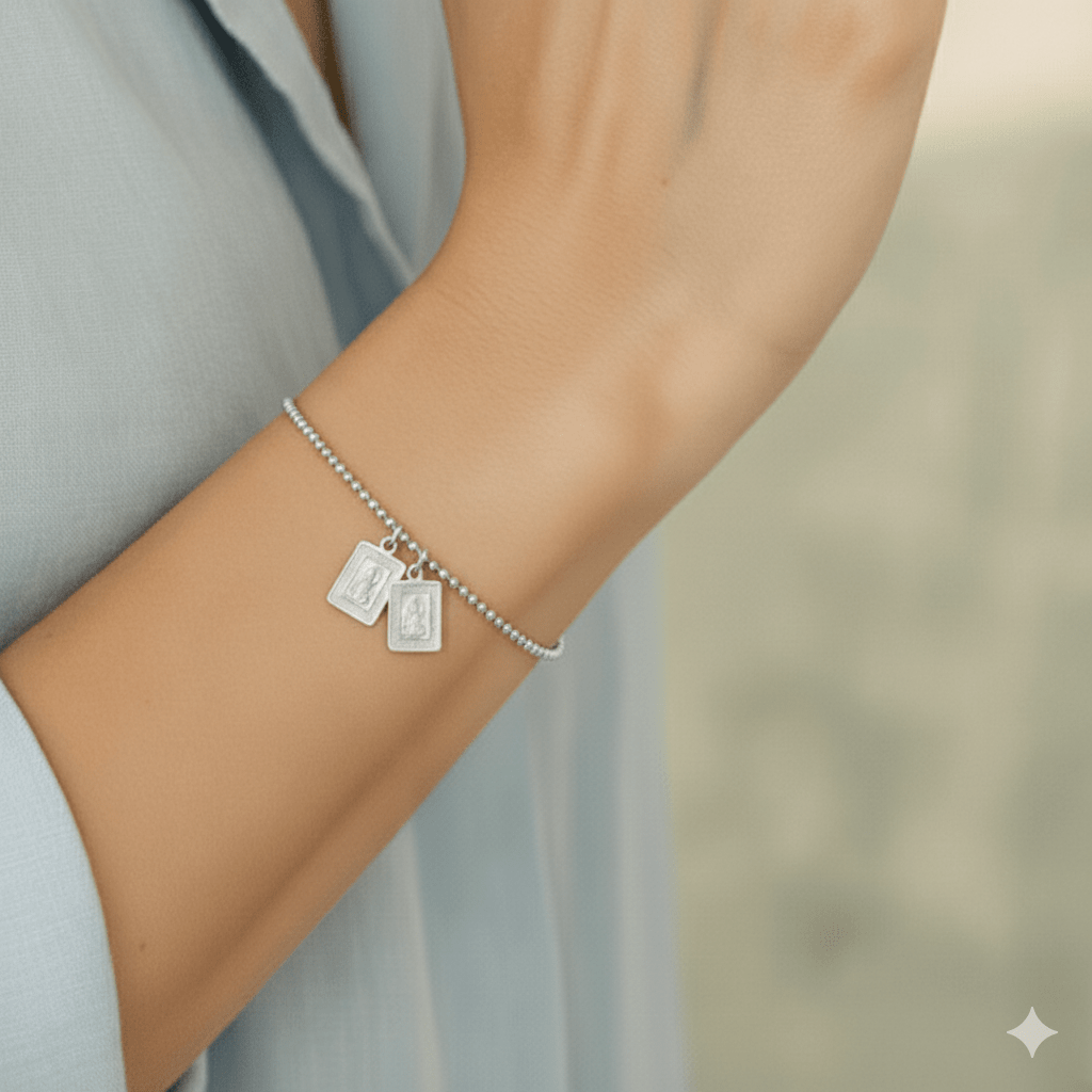 Accessorize any look with the Silver-Plated Mini Scapular Bracelet. This elegant piece features two charm scapulars connected by a single silver-plated chain. The centuries-old design features a modern twist, adding a subtle touch of religiosity to your outfit or showcasing your faith through fashion.