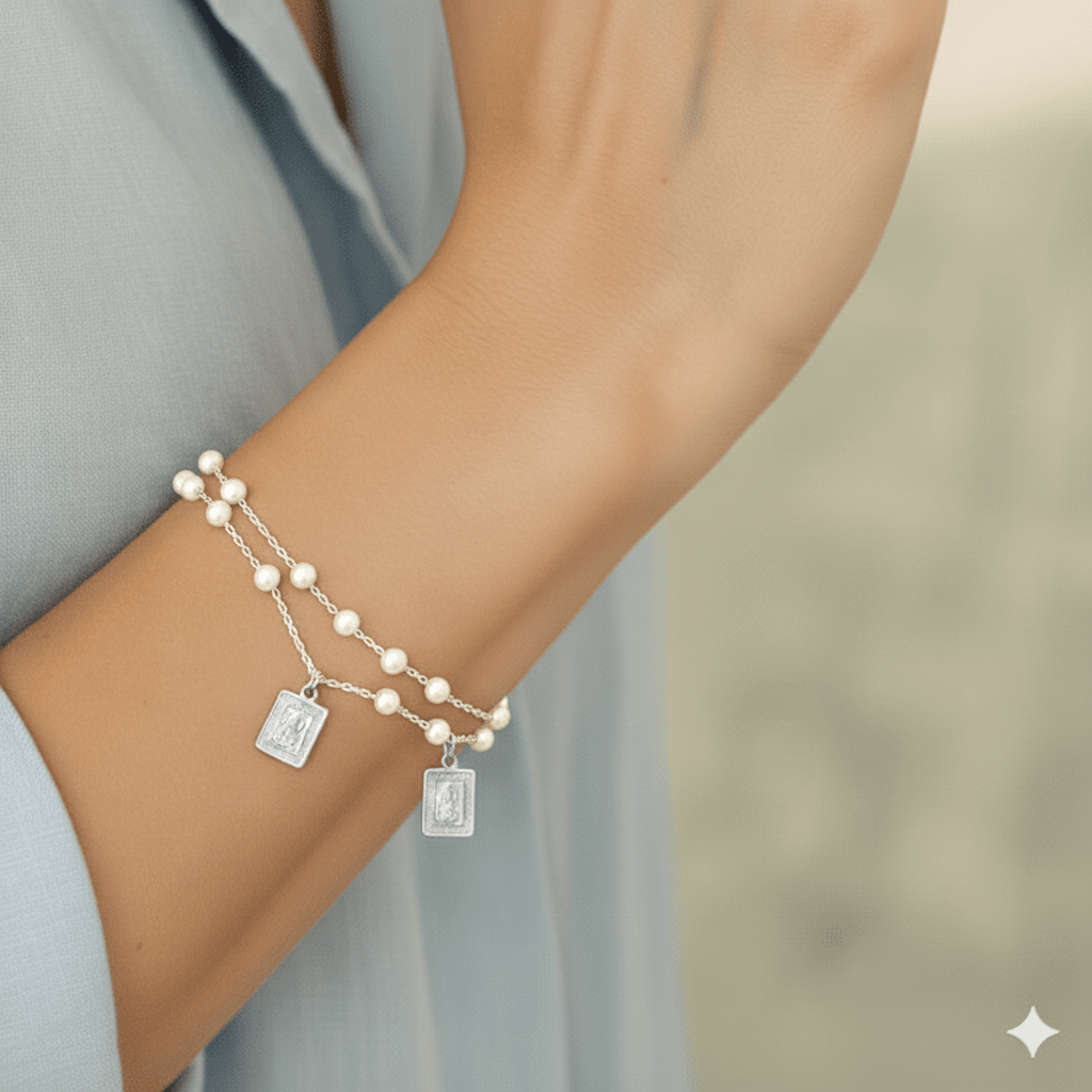 Silver-Plated Pearl Scapular Double Bracelet 7-inch