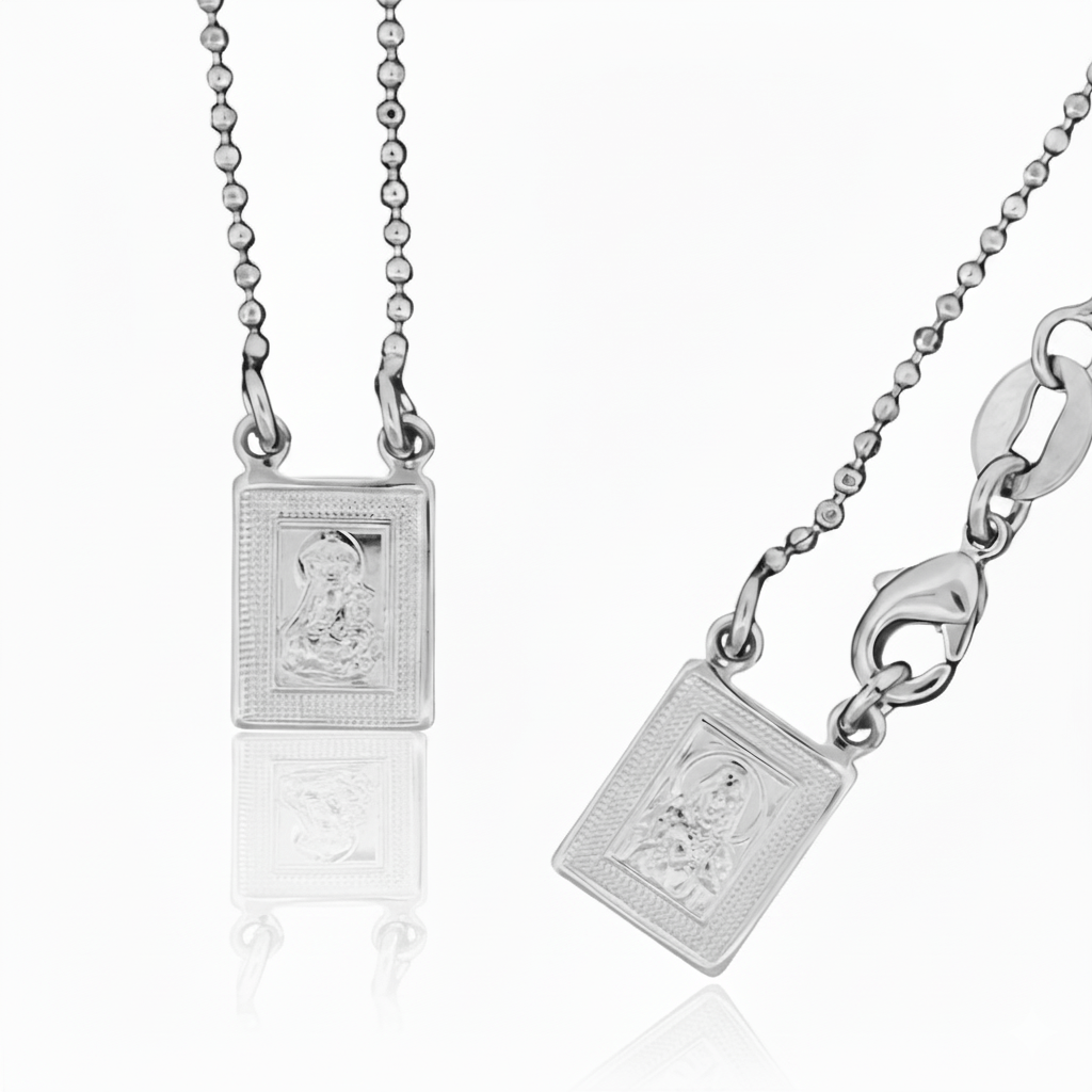 This beautiful scapular necklace is crafted from sterling silver-plated zinc alloy and features two dainty pendants. A delicate chain adds a touch of distinction while supporting the delicate scapular that suspends from the chain. The perfect gift for a girl, boy, or someone special in your life, the Silver-Plated Scapulars Dainty Pendants Necklace adds a touch of glamour to any outfit.