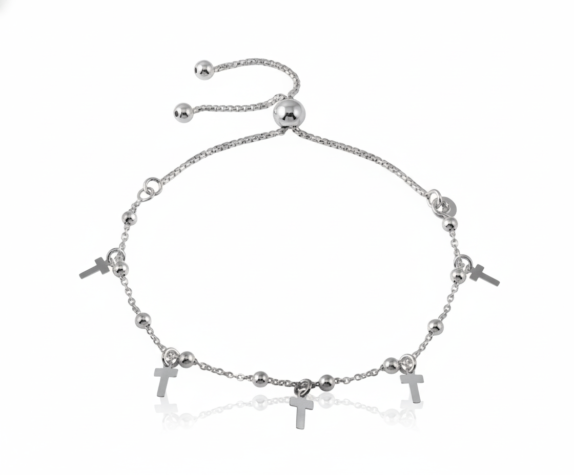 This modern lariat bracelet is a fashionable accessory that boasts impeccable craftsmanship and design, featuring cross charms along the chain. The Silver Beaded Cross Charm Lariat Bracelet is ideal for making an eye-catching statement.