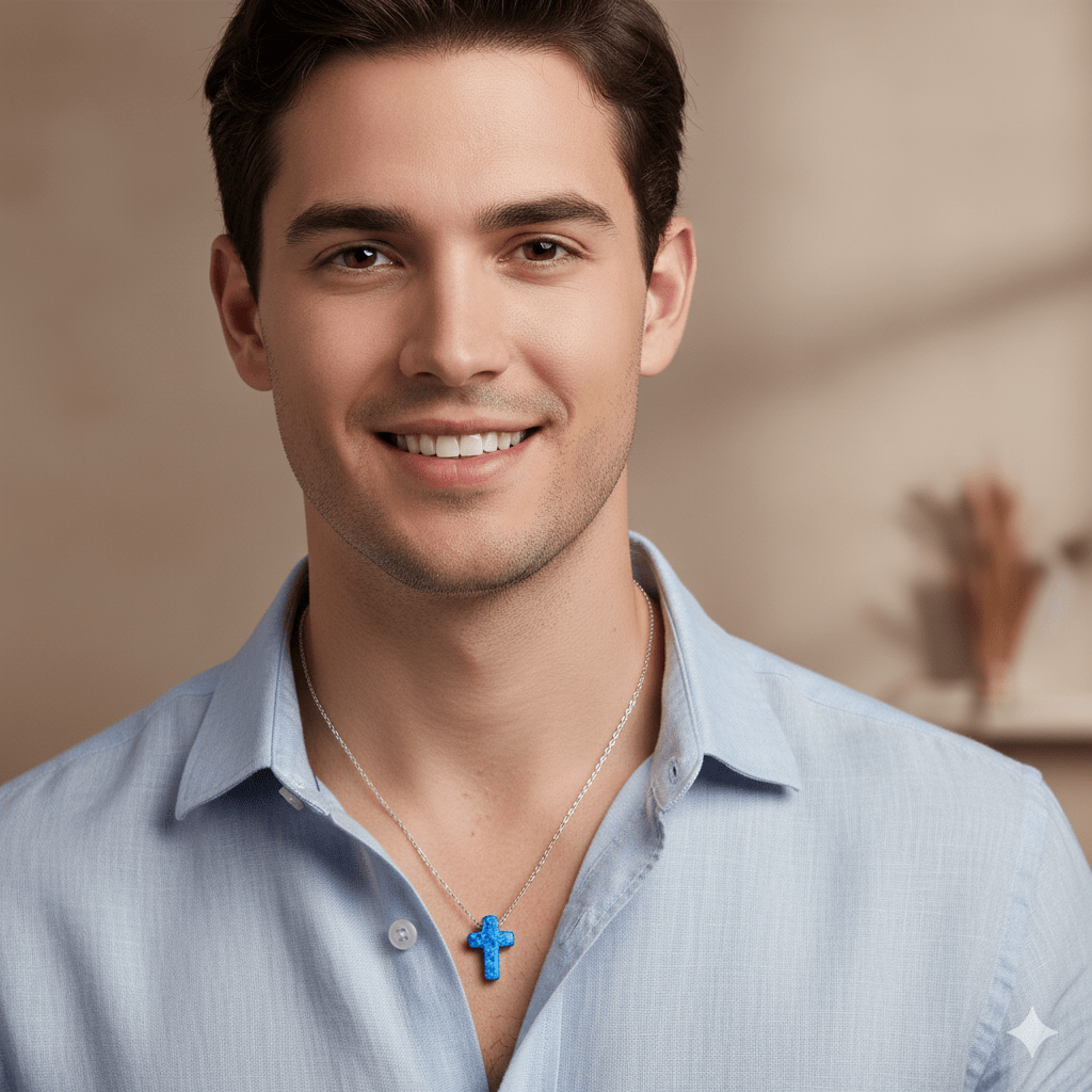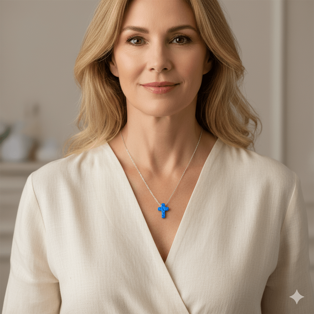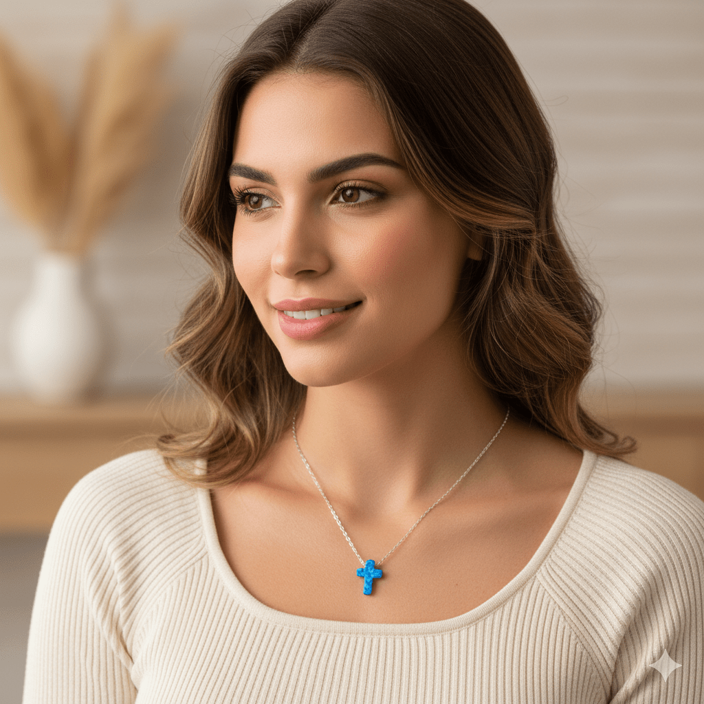 This lovely Opal Cross Necklace features a blue opal cross as the focal piece. It is a feminine piece that adds a touch of femininity to any look and a statement of faith.