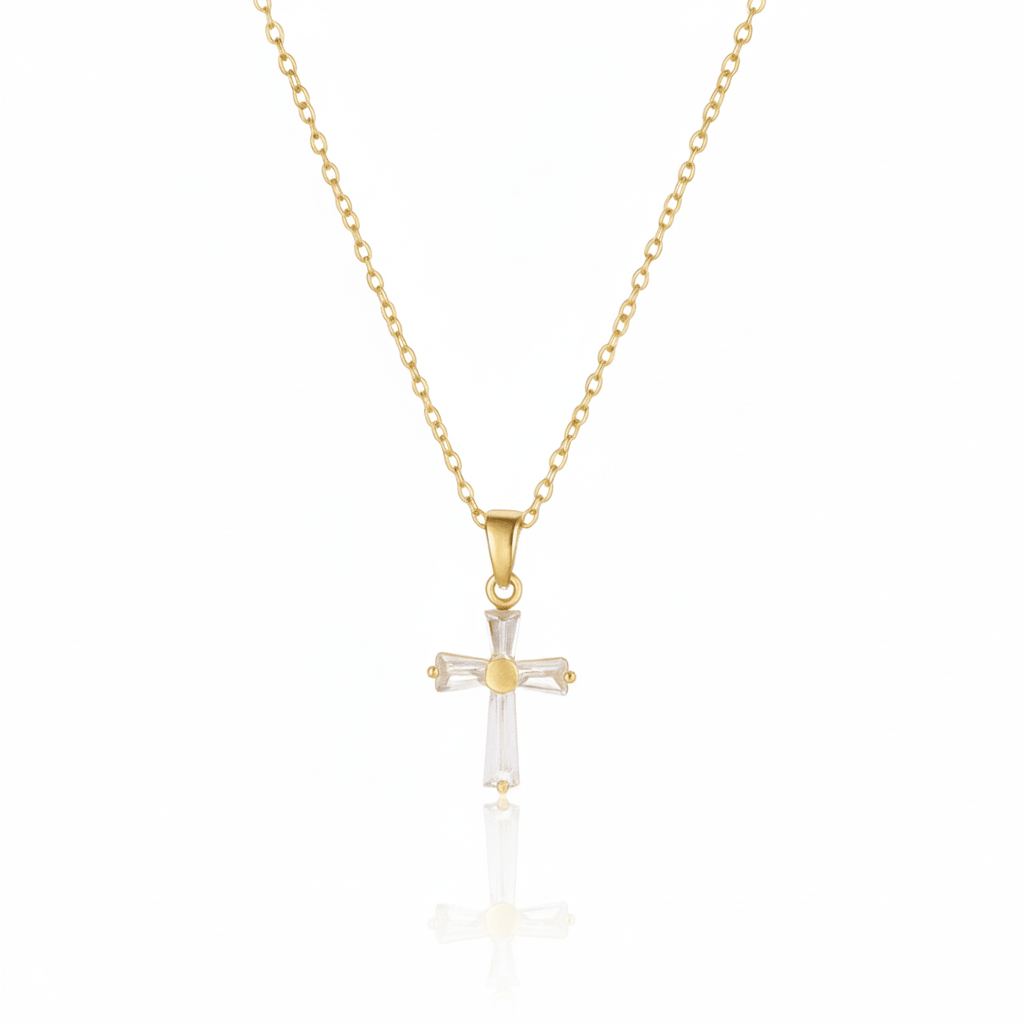 Step into graceful devotion with our Dainty Cross Necklace, a subtle yet striking expression of your faith. Crafted from polished gold-tone stainless steel and adorned with sparkling clear zirconia, this elegant piece beautifully combines minimalist style with spiritual depth. Its lightweight design and petite size make it ideal for daily wear or as a thoughtful gift.