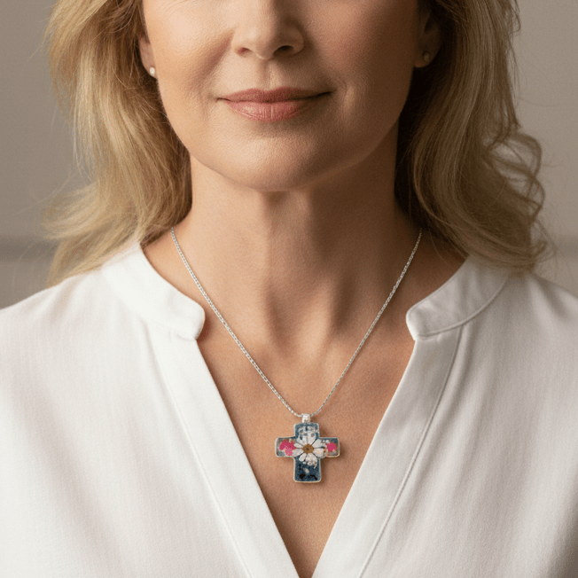 Silver Cross Pendant w/ Pressed Flowers - Guadalupe Gifts