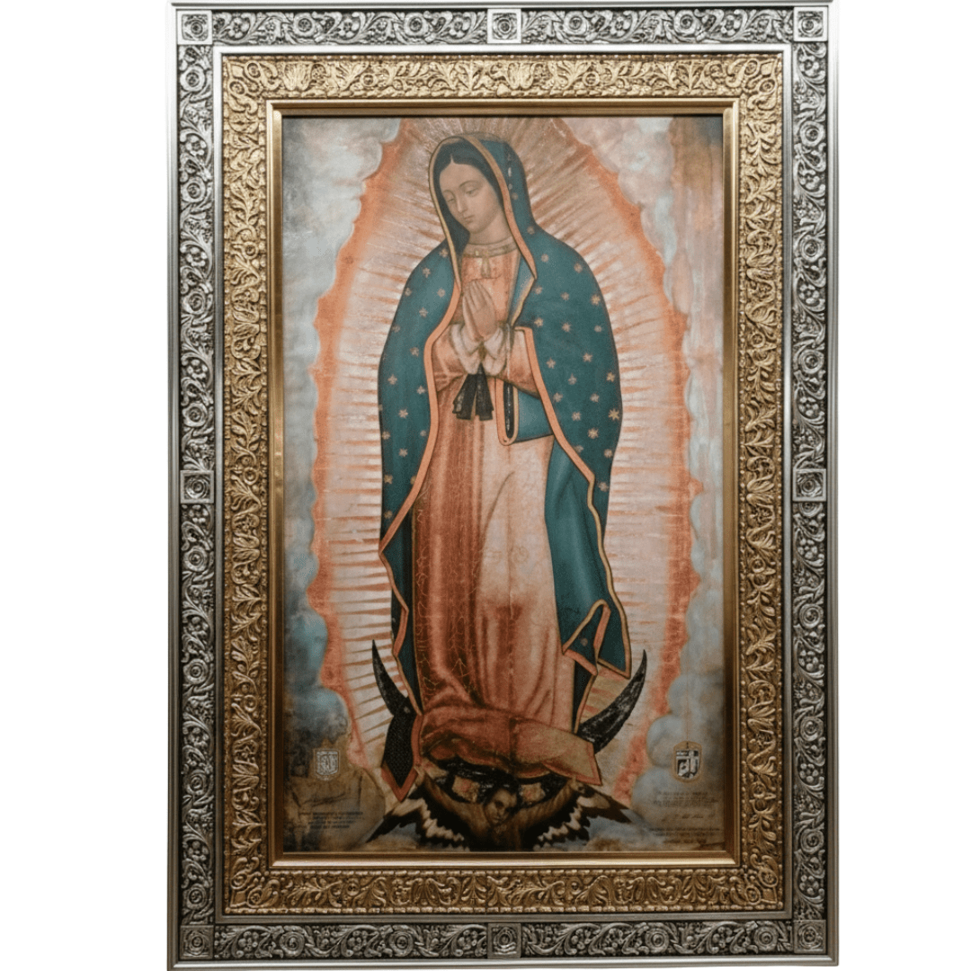 * High-resolution image sourced directly from the Basílica de Nuestra Señora de Guadalupe in Mexico City * "Tilma-style" cotton canvas with official Basilica seals and signatures * Hand-carved solid wood frame with genuine gold & silver leaf (premium finish) * Certificate of Authenticity included * Blessing certificate from the Basilica available upon request