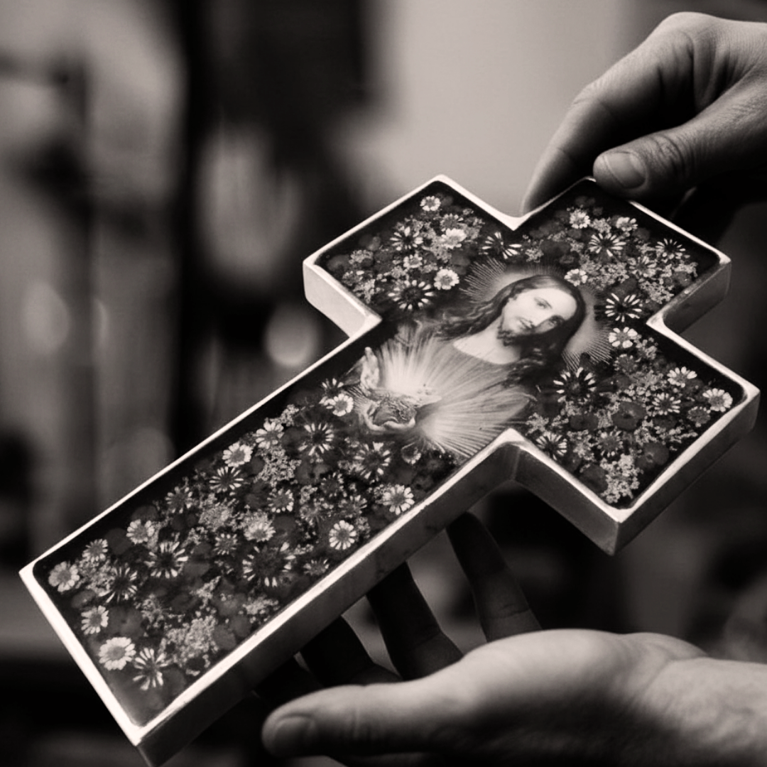 Sacred Heart Grand Wall Cross w/ Pressed Flowers 11" - Guadalupe Gifts