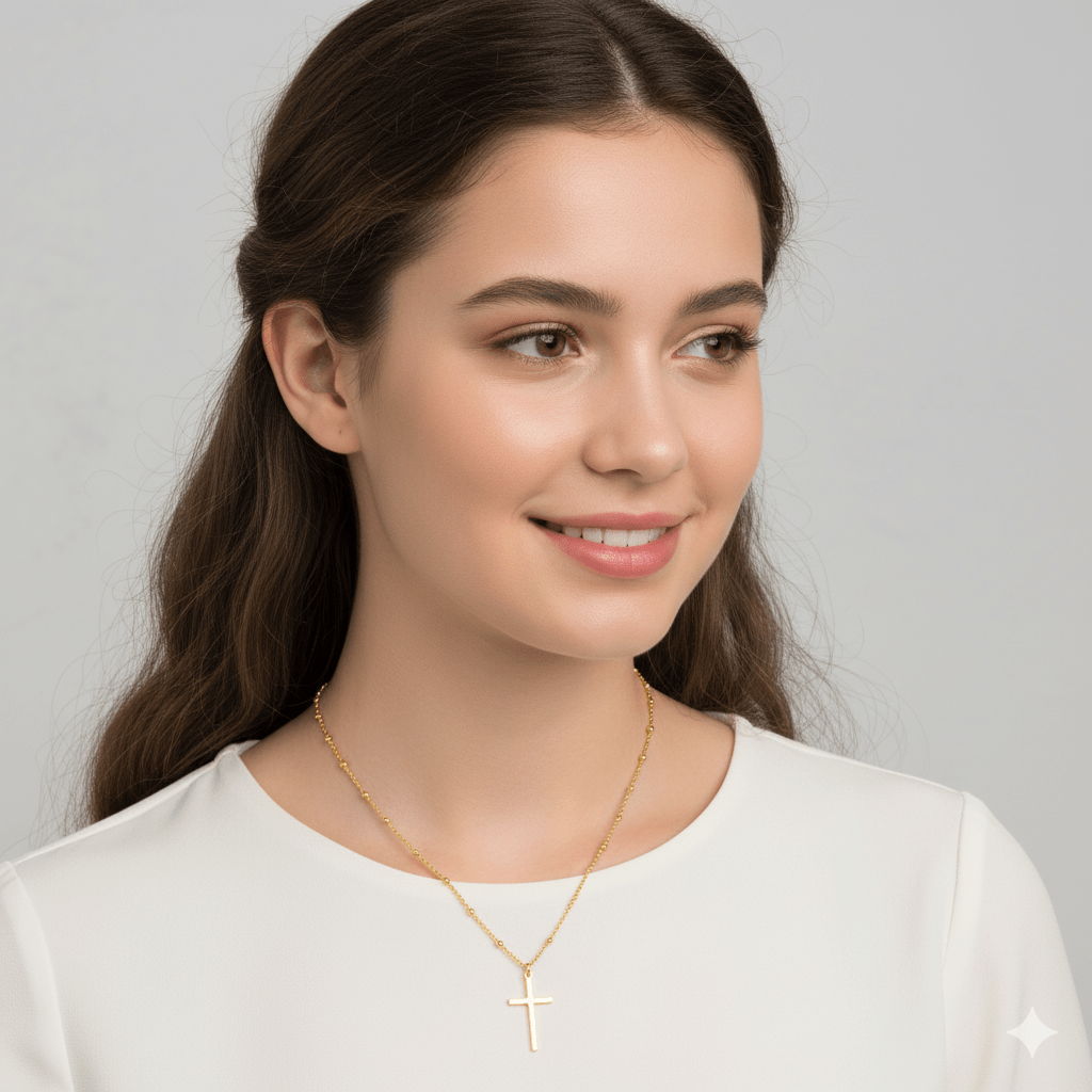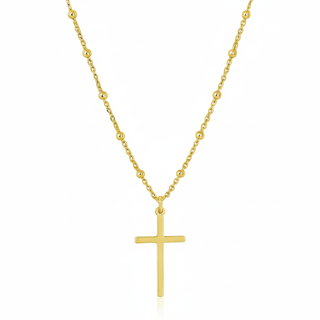 This stunning gold-plated silver cross pendant necklace with a beaded chain is the perfect one to accentuate your statement look. This delicate, dainty piece is ideal for any special occasion or a casual day. The cross itself is made of strong, pure silver and then gold-plated.