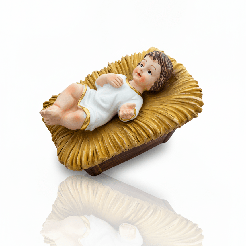 Expertly crafted from durable resin and lovingly hand-painted, this figurine invites deep reflection and reverence. The Christ Child is portrayed in a peaceful repose with lifelike detailing that evokes both purity and tenderness—perfect for seasonal decor or as a year-round reminder of faith.