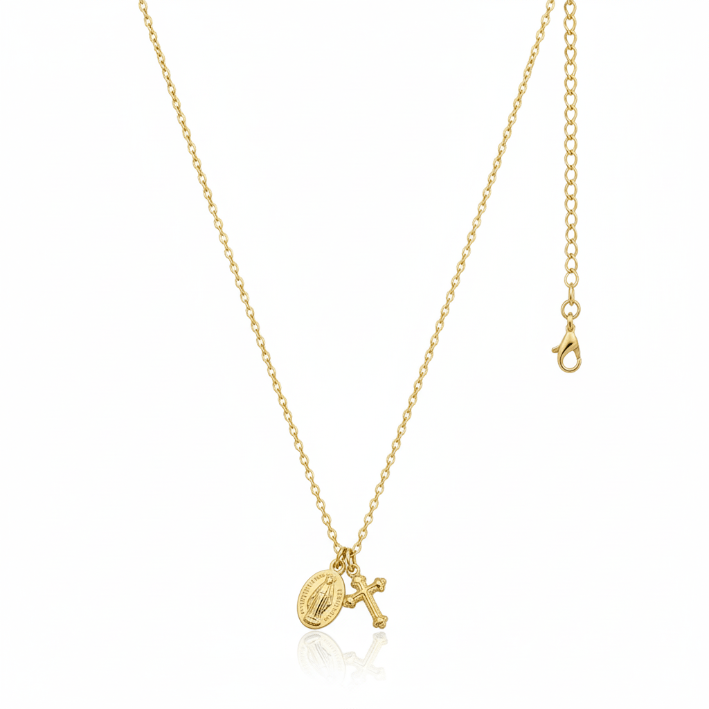 Gold-Plated Dainty Miraculous Medal and Cross Charm Necklace 18-inch
