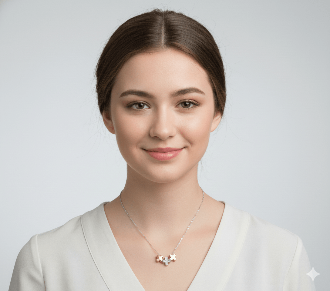 This exquisite, dainty cross necklace features a slender, elegant 3-tone cross charm pendant constructed from solid 925 Sterling Silver with Gold-plated accents. The small size and design complement a variety of looks, making it excellent for everyday wear or special occasions.