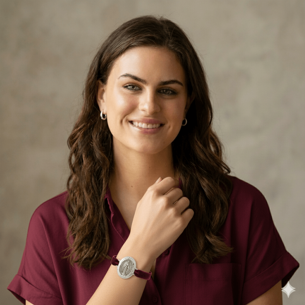 Miraculous Bracelet. Jewelry created from metal alloys in combination with 10 microns of Sterling Silver. Velvet flat string available in a variety of lovely hues. Size: 35 x 22 mm. Cord Length: 7" adjustable/flexible. Made in Spain.