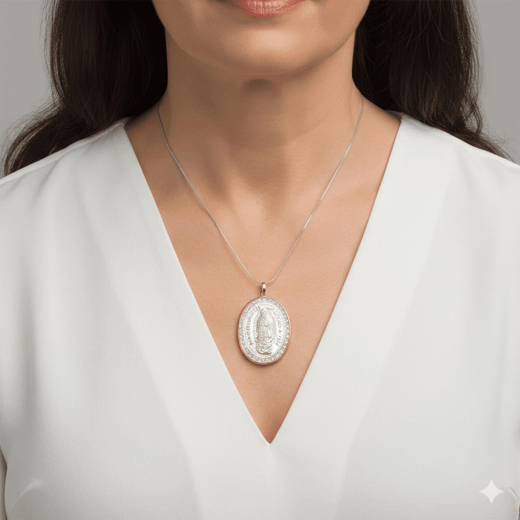 This Our Lady of Guadalupe medal is handcrafted in Mexico using sterling silver and framed with a solid 14k gold bezel, creating a refined two-tone devotional design. Its balanced proportions and classic form offer a strong visual presence while remaining suitable for daily wear or devotional gifting.