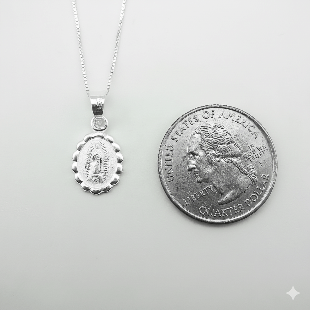 Are you looking for a dainty and meaningful necklace? Our Our Lady of Guadalupe necklace is perfect for you! This classic medal features Our Lady of Guadalupe at its center, surrounded by delicate, petal-like borders. The genuine Mexican sterling silver is outstandingly crafted, and the pendant hangs from a delicate chain. The Sterling silver is hypoallergenic, making this necklace a great everyday piece of jewelry. It's also a perfect gift for men and women!