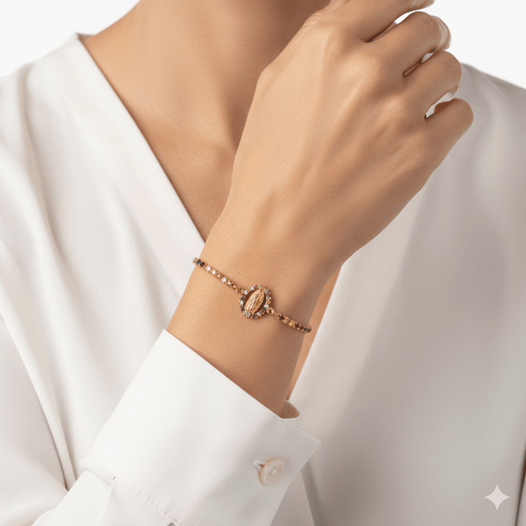 Praise the Blessed Virgin Mary with this exquisite Gold-Plated Lady of Guadalupe Colorful Zirconia Adjustable Bracelet. This Faith-inspired bracelet features an image of Our Lady of Guadalupe, handcrafted and encrusted with multicolored sparkling Cubic Zirconia stones set in Rose Gold plating. Delicate accents add a unique appeal and are adjustable to fit any wrist size perfectly.