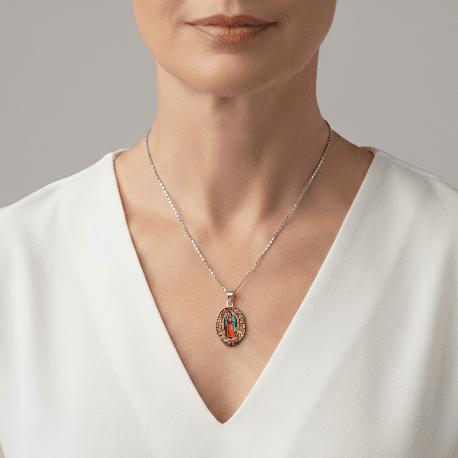 This necklace features a detailed image of Our Lady of Guadalupe set within an oval sterling silver pendant. It is handcrafted in Mexico using real pressed flowers preserved in resin. Each flower is individually selected, resulting in variations that make every piece unique.