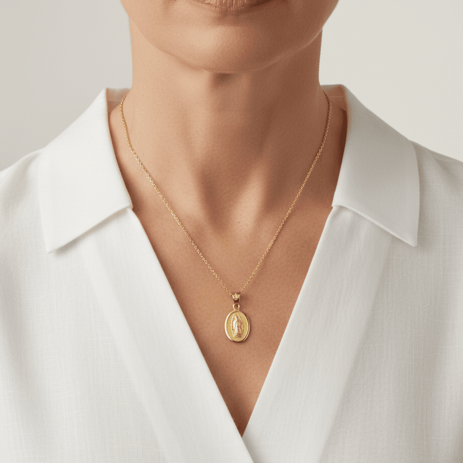This stunning Virgen de Guadalupe gold pendant is made of gold, creating an elegant and eye-catching piece of jewelry. This beautiful piece depicts the Virgin Mary in a Guadalupe design, sure to look beautiful around any neck. The pendant features a matte finish, lending it a subtle aesthetic that is perfect for everyday wear or special occasions.