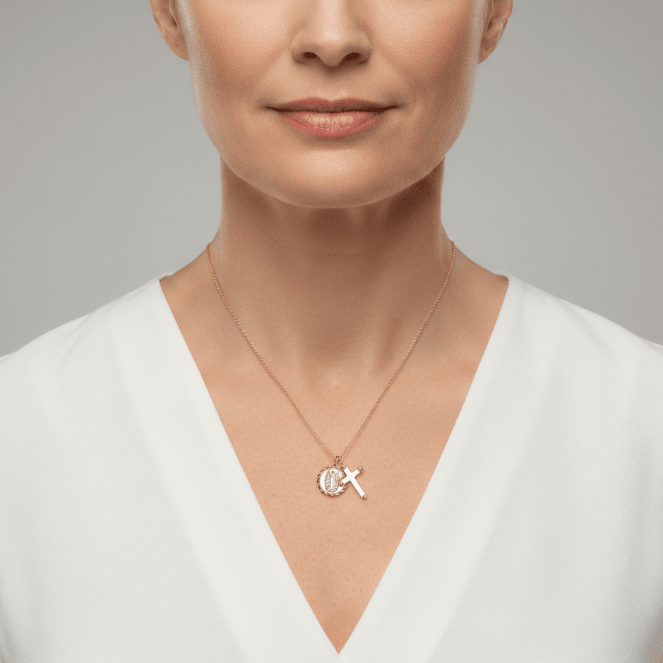 We adore the Virgin Mary and Cross Necklace in gold. The small but impactful pendant features a shiny cross that subtly complements any outfit. This necklace is perfect for any occasion and makes an excellent gift for someone special.