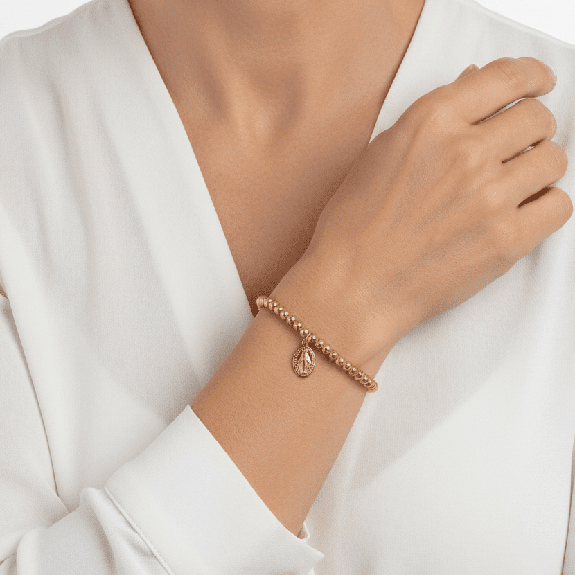 This bracelet features a gold-plated beaded chain adorned with a dainty Miraculous Medal charm, offering a refined, minimalist expression of faith. Its adjustable design ensures a comfortable fit, making it suitable for layering or wearing alone.