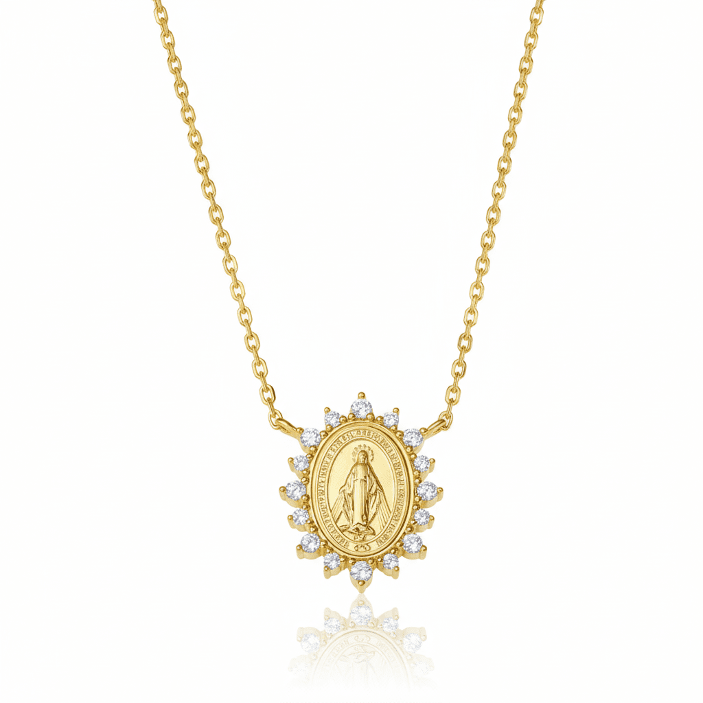 Gold Vermeil Miraculous Medal Necklace with Cubic Zirconia Accents 18" - Guadalupe Gifts
