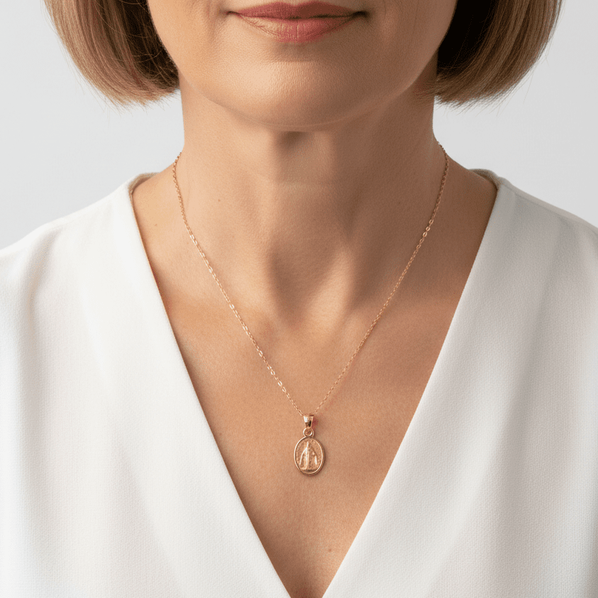 This elegant miraculous medal gold pays homage to its namesake with a stunning tiny oval-shaped pendant. The miraculous medal gold features a Virgin Mary pendant with intricate engraved detailing, perfect for any religious observer or symbolic gift. Crafted from real 14k gold-filled, it will surely last through generations of wear, making it a timeless piece that can be passed down through the years.
