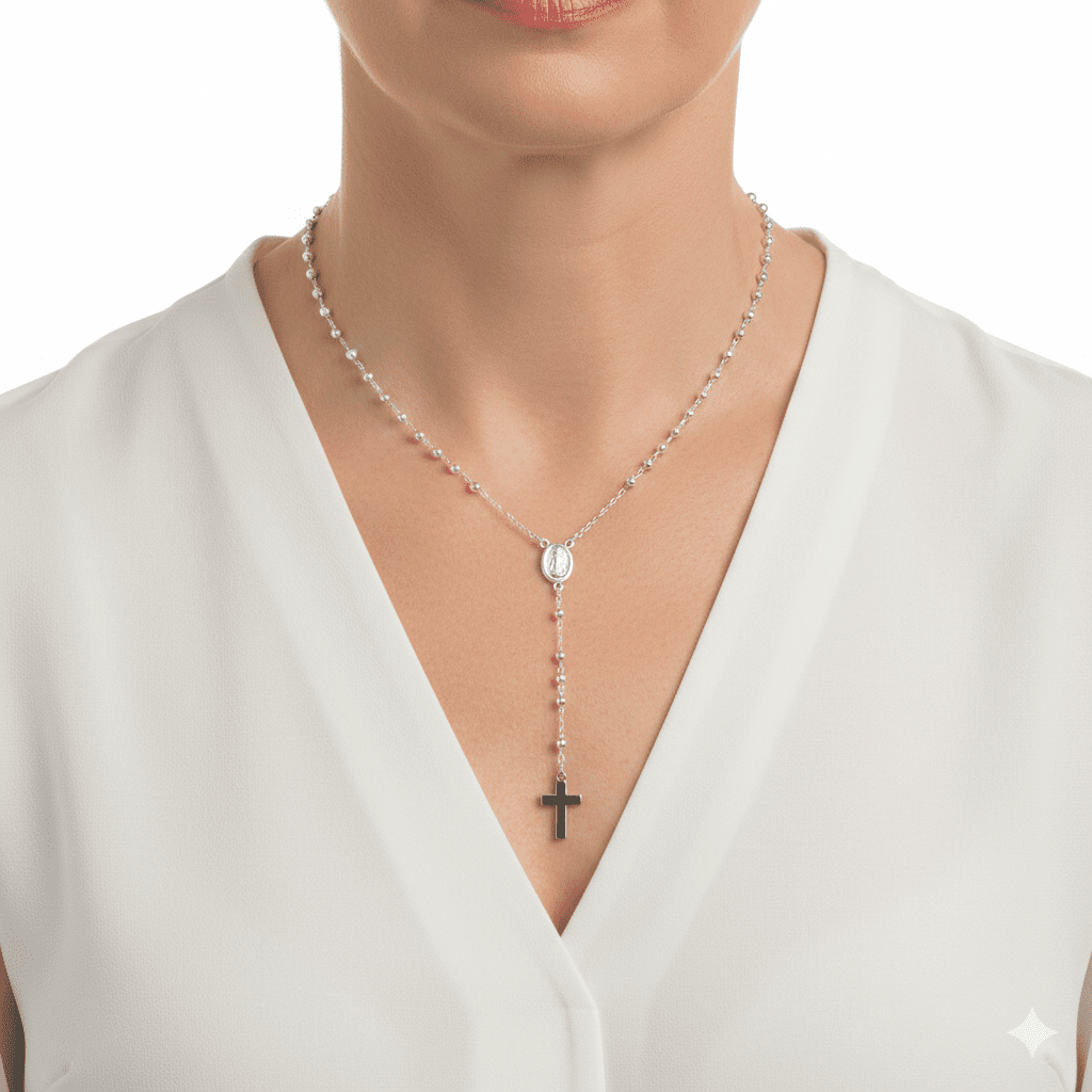 The delicate silver links feature beads for each Hail Mary prayer and smaller drop circles that mark significant parts of the traditional prayer ritual. Each time someone touches their fingertips to one of these circles, they offer a special prayer that strengthens the different spiritual adventures of life.
