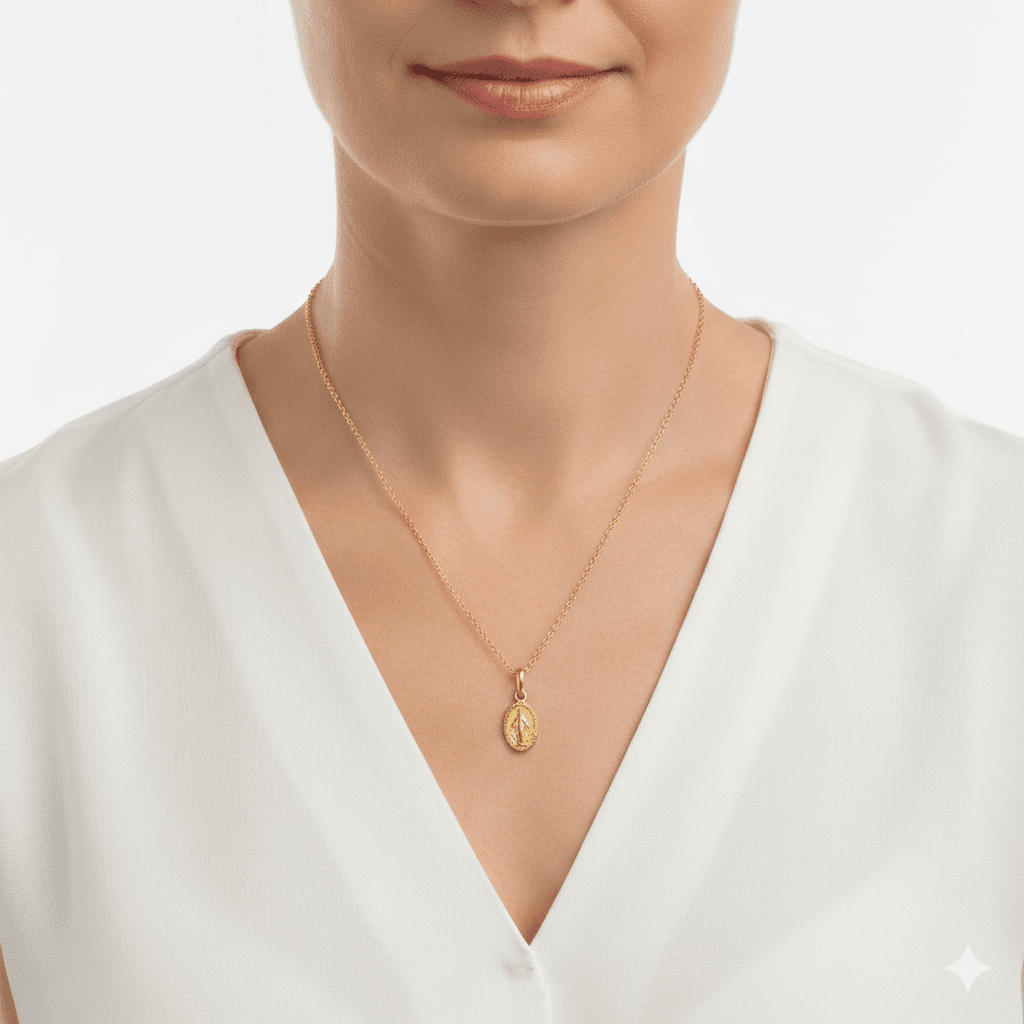 The iconic miniature portrait of the Virgin Mary on the front of the medal necklace is a reminder of faith and devotion.