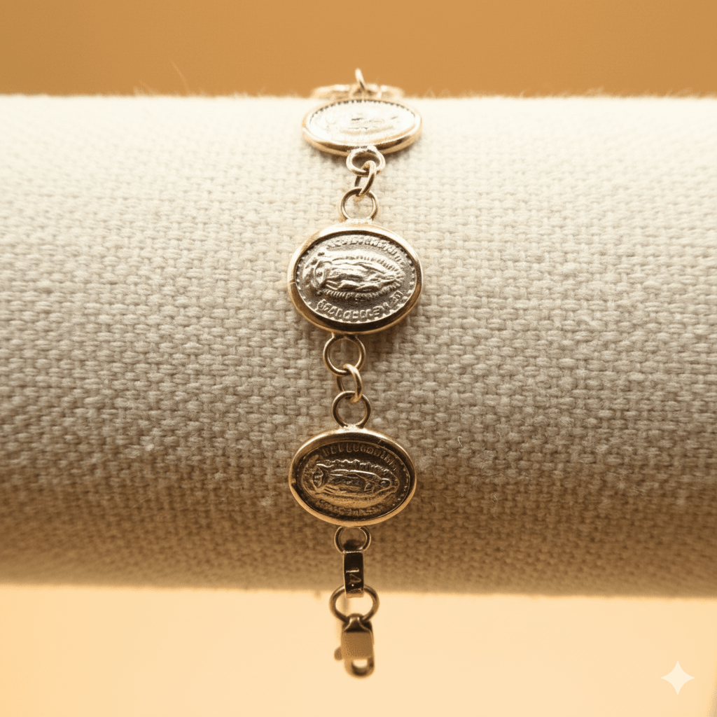 This beautiful coin bracelet is a timeless accessory that blends traditional and modern elements. It holds significant sentimental value and is a cherished gift in many cultures, particularly for Confirmation or Adult RCIA ceremonies. The bracelet features a depiction of Our Lady, who serves as a comforting presence during times of challenge. It represents the essential values of faith, family, and love, and will surely be a cherished accessory for future generations.