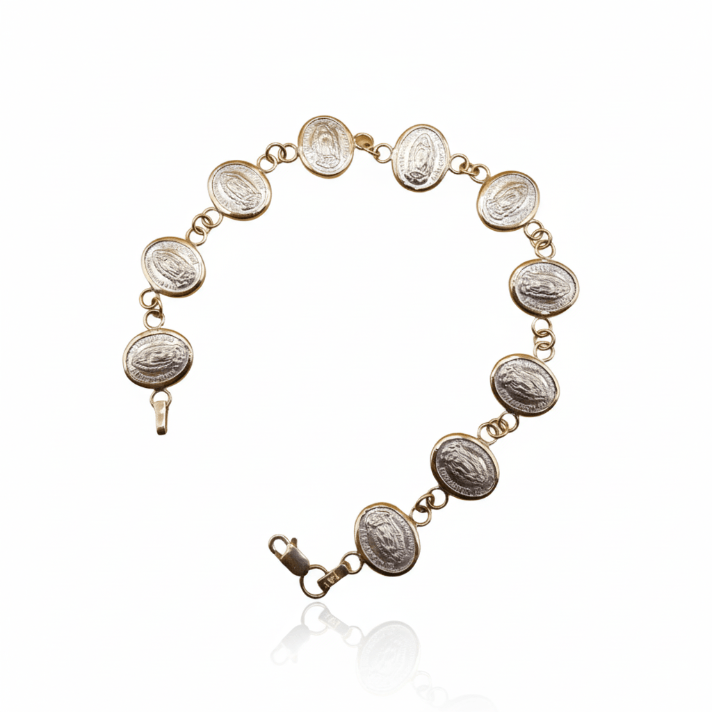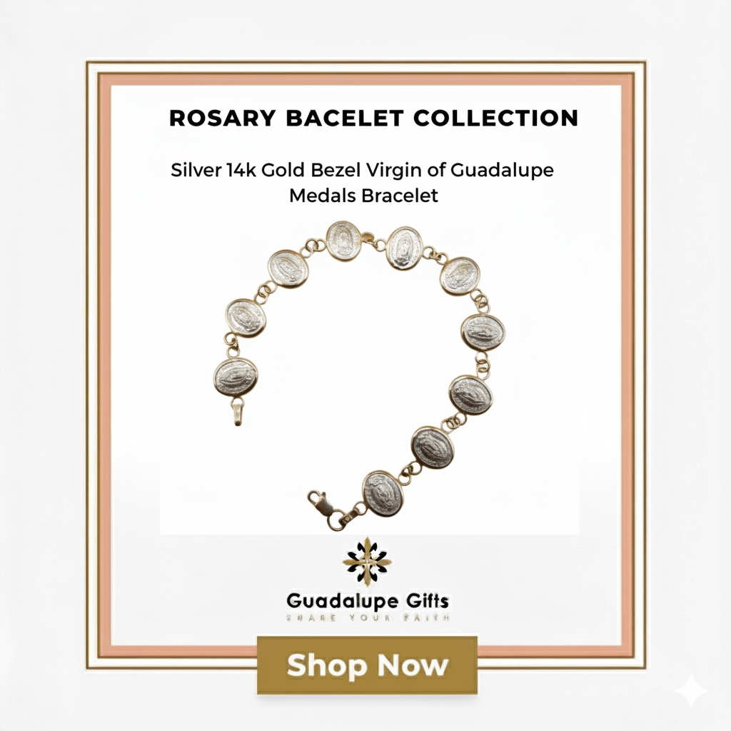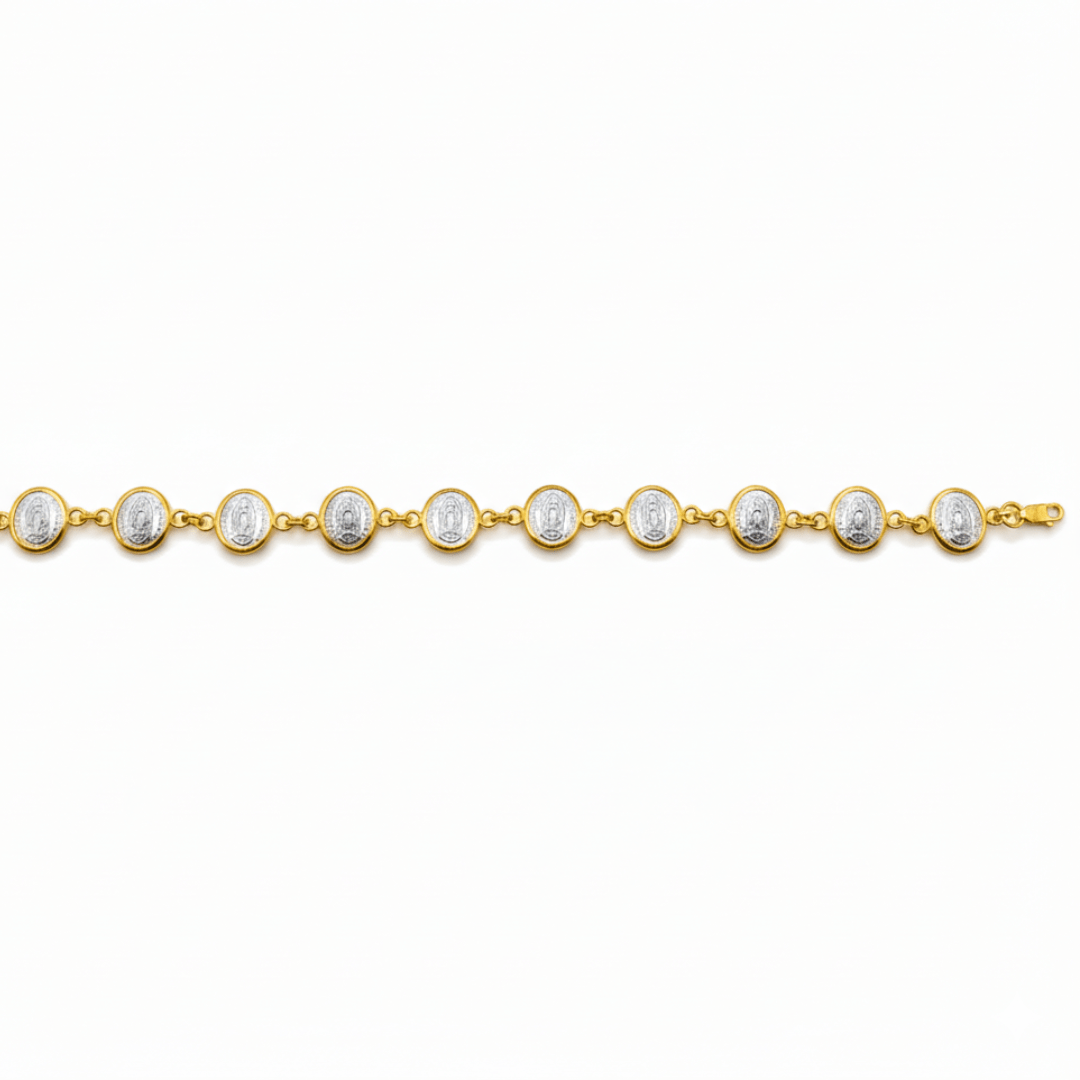 Celebrate your faith with this Silver 14k Gold Bezel Virgin of Guadalupe Medals Bracelet! Handcrafted with genuine silver and a 14k gold bezel, this beautiful tribute to Our Lady of Guadalupe perfectly shows your devotion to the Blessed Virgin Mary. Show your love with this unique rosary bracelet!