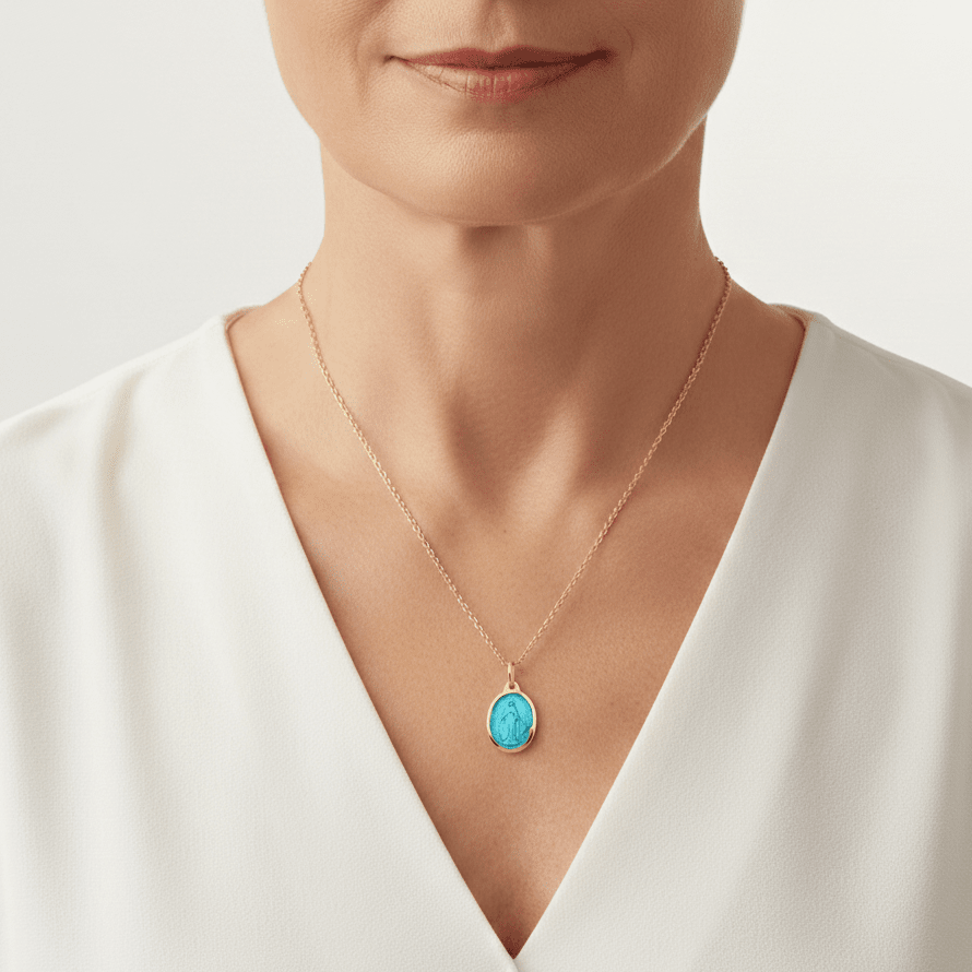 This Miraculous Medal necklace features a gold-plated medal with deep blue enamel, inspired by the original design revealed by the Blessed Virgin Mary to St. Catherine Labouré in 1830 at the Rue du Bac Chapel in Paris.