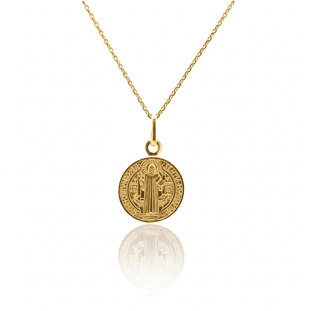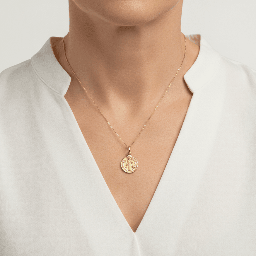 This elegant st benedict medal necklace is a perfect complement to any outfit. Its delicate design is understated yet stylish, making it an excellent choice for those seeking a simple necklace to wear on its own or to layer with other necklaces.