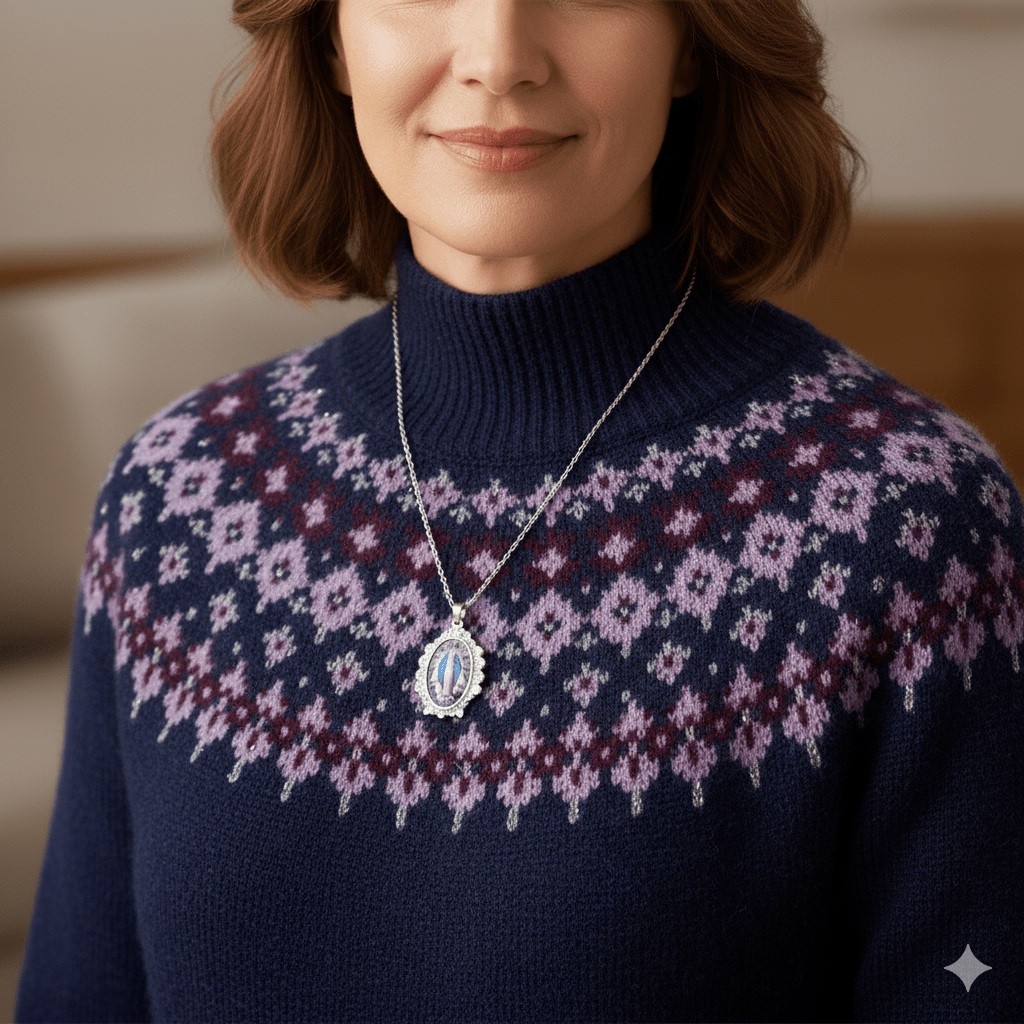 Sterling silver necklace featuring an image of Our Lady of Grace set in a detailed Baroque-style frame.