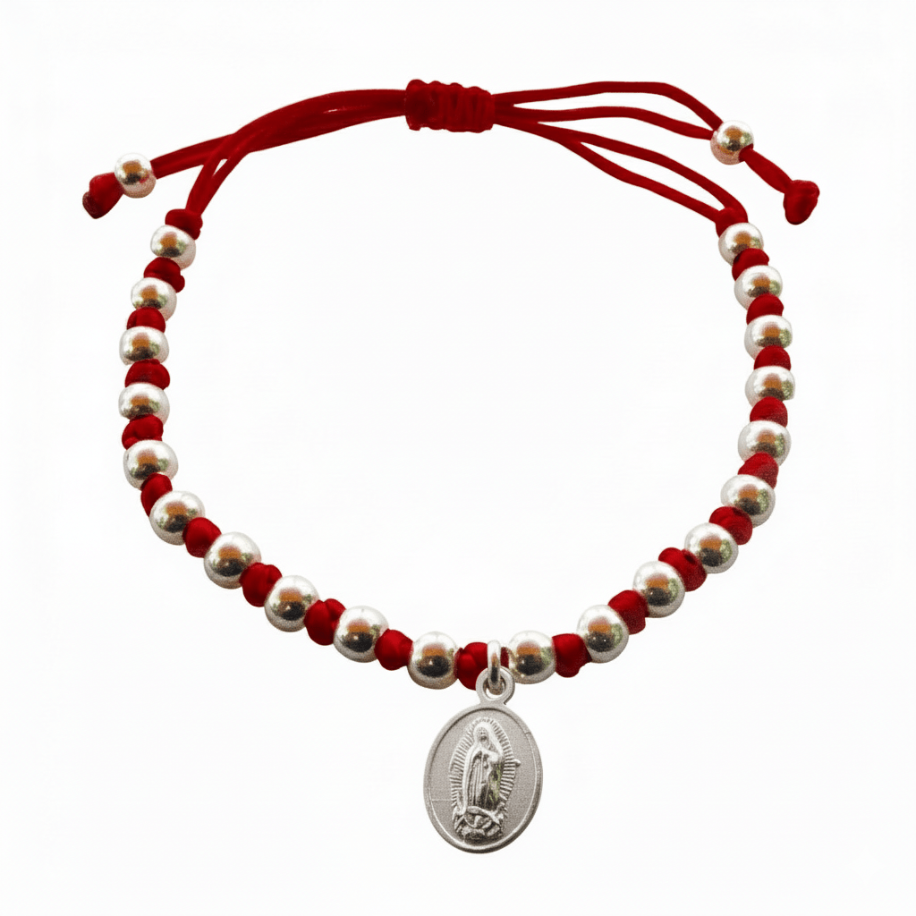 An adjustable bracelet with braided details all around, containing gleaming silver beads. A detailed and beautiful pendant relief representing Our Lady of Guadalupe can be seen hanging from this bracelet. This bracelet is an excellent accessory for those who want a daily reminder of their Catholic faith and a symbol of the protection of Our Lady of Guadalupe.