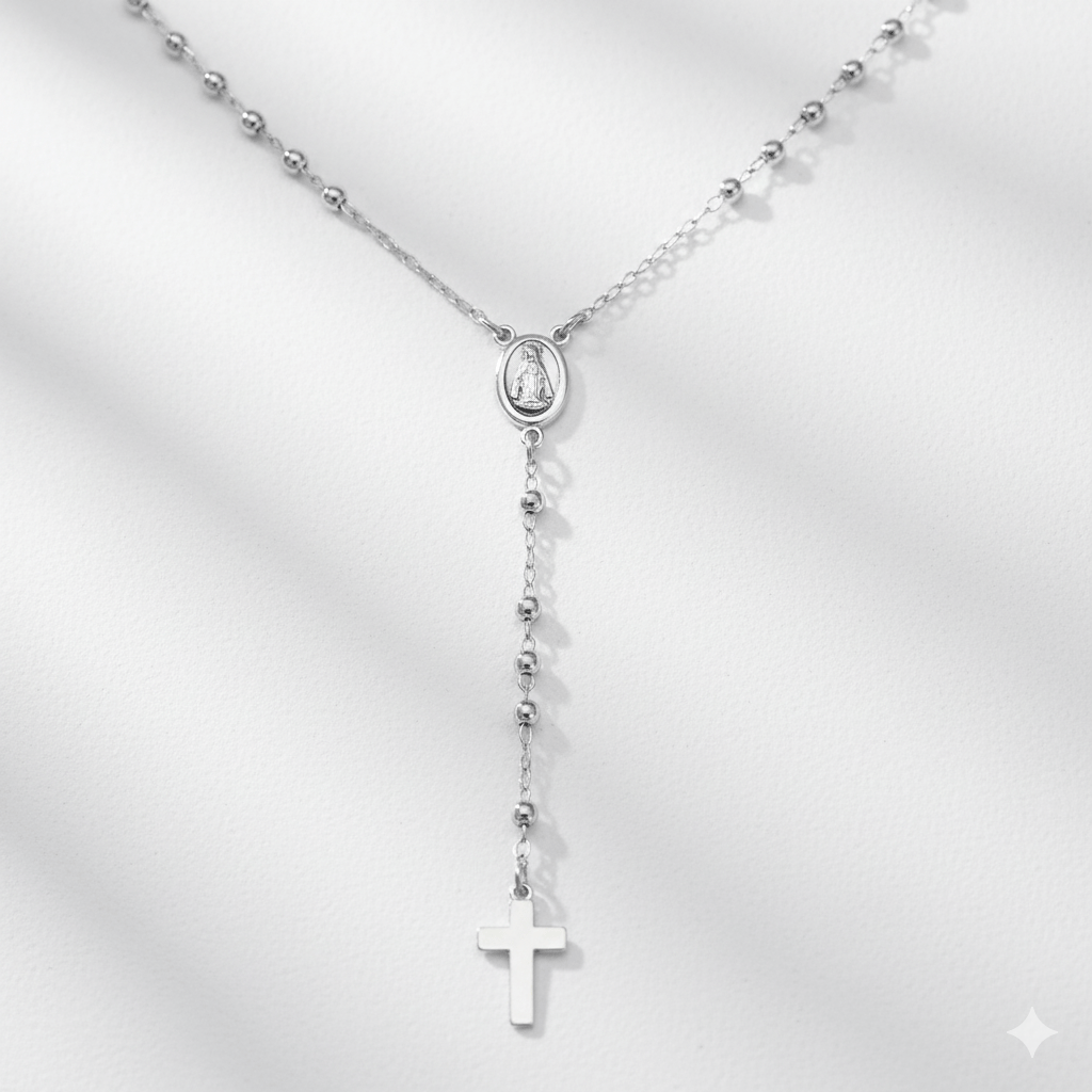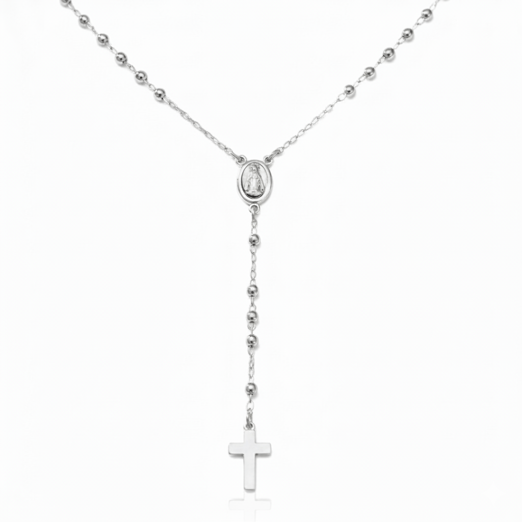 The delicate silver links feature beads for each Hail Mary prayer and smaller drop circles that mark significant parts of the traditional prayer ritual. Each time someone touches their fingertips to one of these circles, they offer a special prayer that strengthens the different spiritual adventures of life.