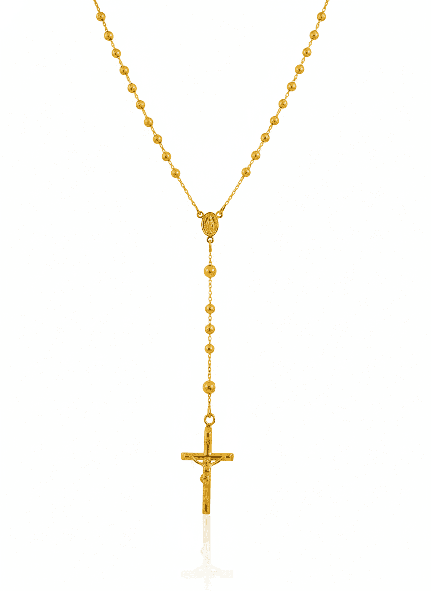 Crafted from solid 14kt yellow gold, this rosary necklace features an 18-inch high-polish chain secured with a sturdy lobster clasp for everyday wear. The necklace gracefully incorporates traditional rosary elements: a delicate Miraculous Medal (5.7mm x 8mm), a finely detailed crucifix (26mm x 16.4mm), and beads in two sizes4mm (6 beads) and 3mm (53 beads)—designed to guide prayer and reflection.
