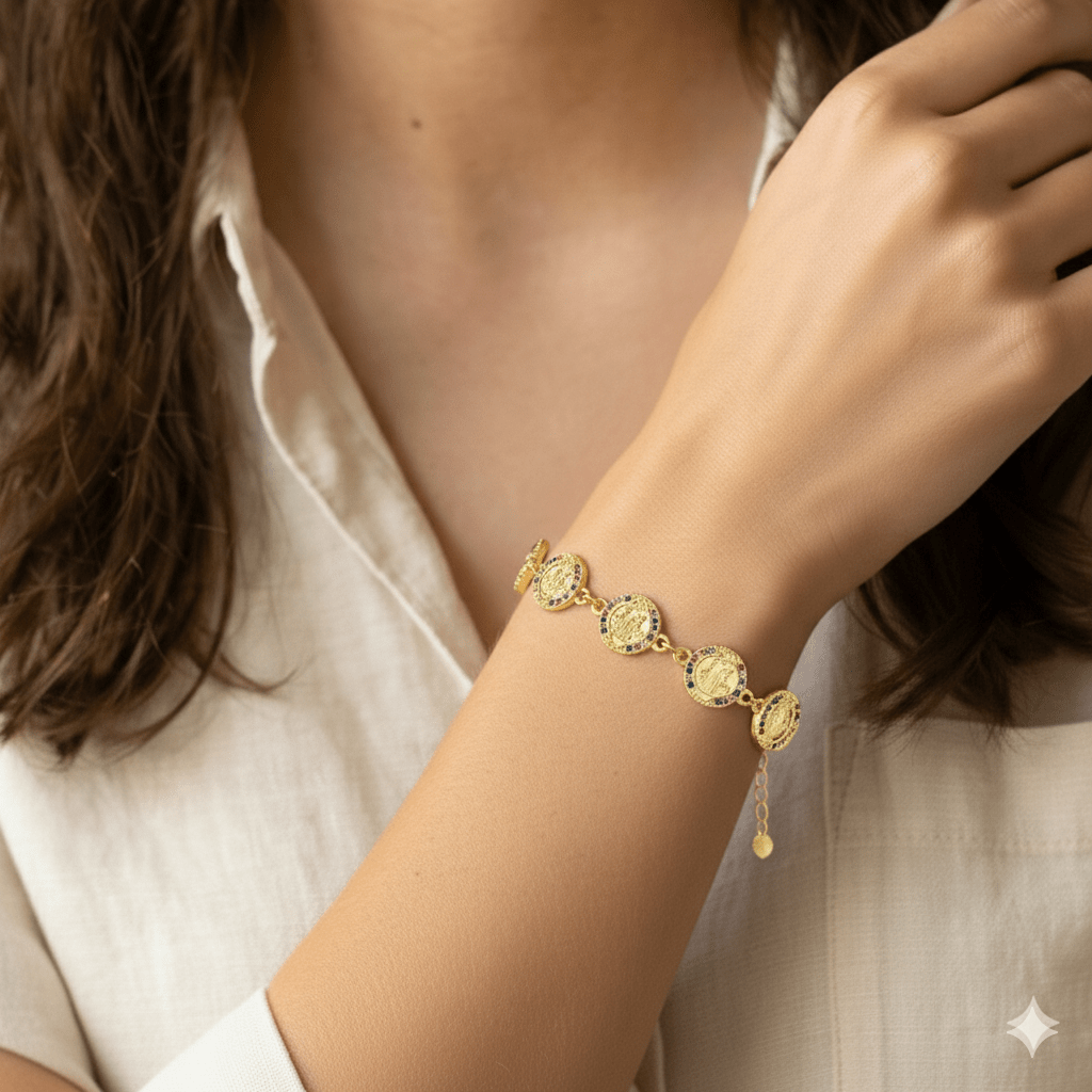 Celebrate faith and elegance with this stunning San Benito Bracelet. Crafted from glossy gold-plated metal, it showcases a decorative coin charm with the revered St. Benedict Medal. Crystals provide a subtle sparkle, and the adjustable chain guarantees a comfortable fit for any wrist. Ideal for everyday wear or special events, this bracelet beautifully expresses devotion and adds a stylish touch to any ensemble.