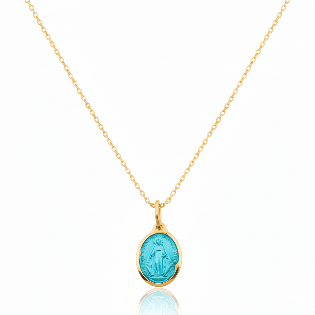Carry a touch of Parisian grace with our 18" Rue du Bac Blue Enamel Miraculous Medal Necklace. This exquisite gold-plated medal, featuring delicate blue enamel detailing, is sourced directly from the Chapel and symbolizes faith and protection. Crafted in France, this dainty and elegant piece is perfect for everyday wear or special occasions.